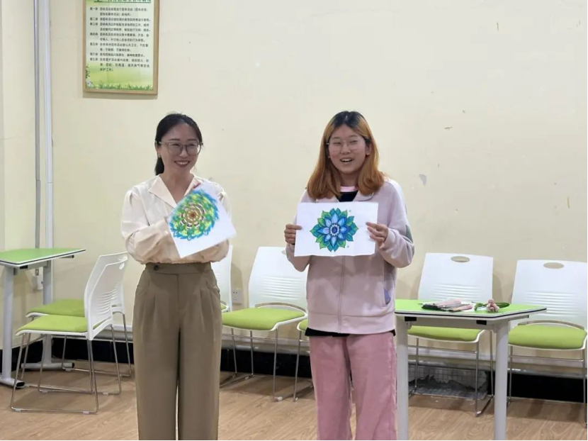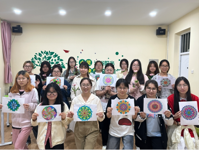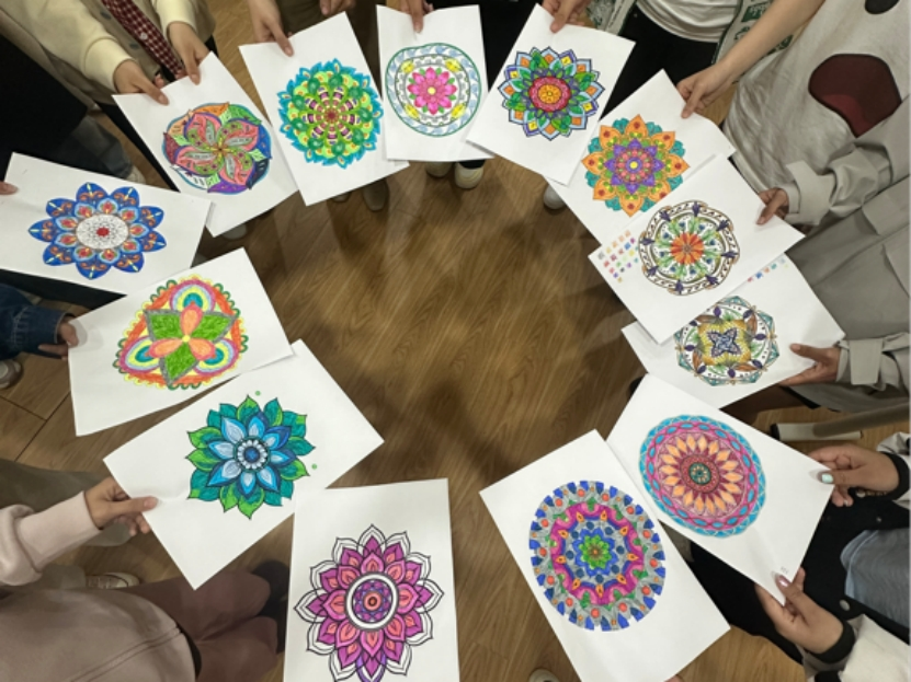 “绘心绘影”心理绘画活动中,同学们通过曼陀罗涂色释放焦虑,其圆形结构以和谐完整的象征带来安全感,让学生在稳定框架内用色彩表达内心、整合冲突。创作时的专注,不仅能缓解压力、提升专注力,还能促进自我觉察,实现心理平衡。这些作品蕴含个人情感与集体象征,观者也能从中感受艺术疗愈身心的魅力。