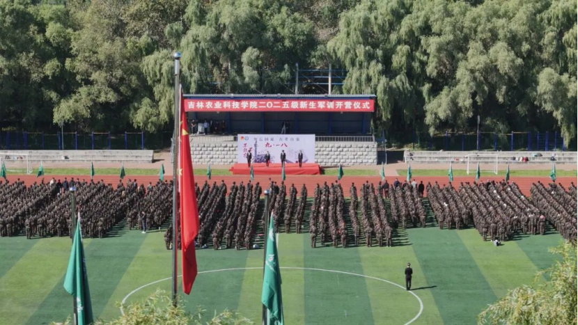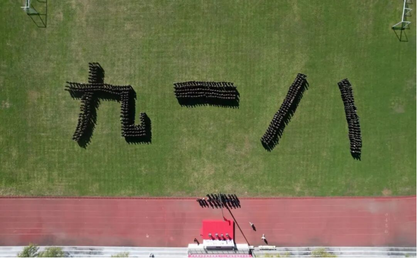 随后的朗诵环节中,师生以《在太行山上》《没有共产党就没有新中国》为背景音乐,讲述了中华民族从浴血抗战到伟大复兴的壮阔征程。从平型关大捷到脱贫攻坚,从“两弹一星”到“一带一路”,铿锵的词句展现了中国共产党的领导伟力和新时代的辉煌成就。三次防空警报穿插其间,每一次静默都是对历史的叩问,对未来的期许。“勿忘国耻,振兴中华!请党放心,强国有我!”9时33分,全体新生高举右拳,以震彻云霄的誓言回应时代的召唤。活动尾声,师生齐唱《我和我的祖国》,嘹亮的歌声在田径场上空回荡,将爱国情怀推向高潮。