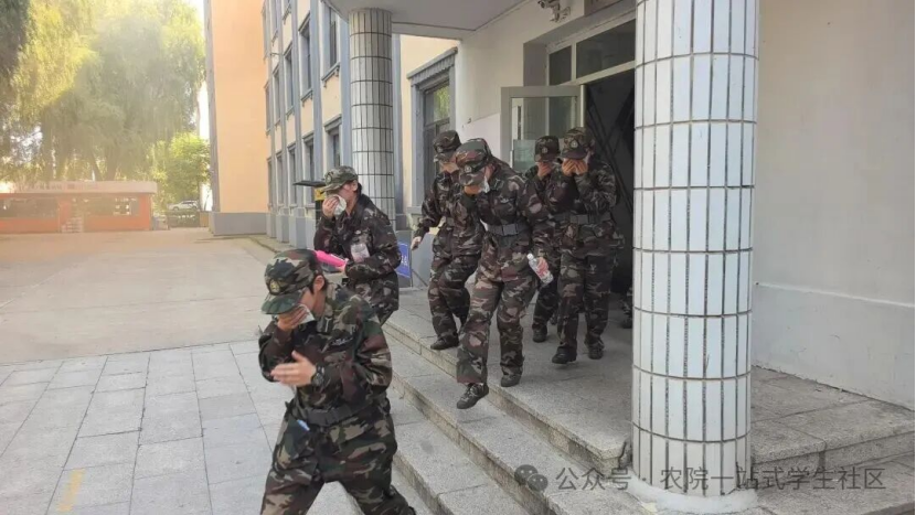 随后,军训教官带领学生分区域前往一、四、九、十公寓指定楼层就位。随着总指挥一声令下,“消防逃生疏散演练开始!”各公寓楼内立即模拟火情,学生们在教官引导下,按照预定路线快速、有序撤离至安全区域,整个过程紧张而不慌乱,充分展现了良好的应急素养。