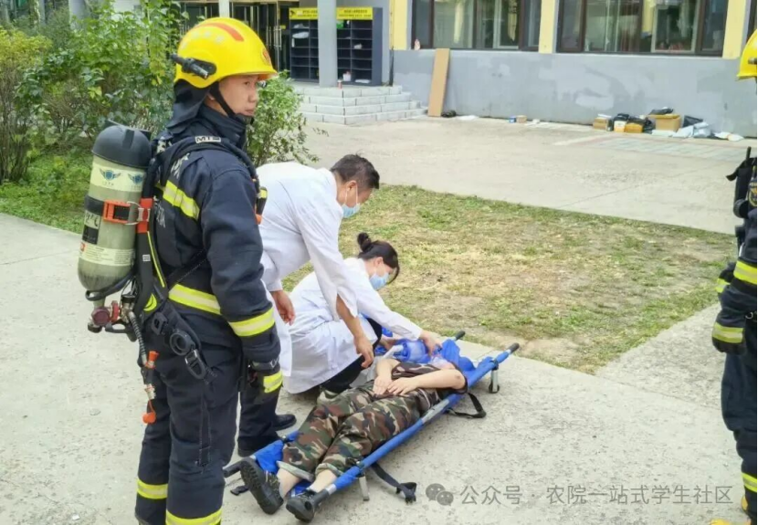 十公寓一楼115房间有1名同学模拟“受伤被困”,消防救援人员迅速赶到,使用担架将其平稳抬出;