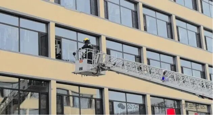十公寓三楼307房间有1名同学模拟因“火情阻碍”无法撤离,消防救援人员立即架设举升消防梯,从窗外将其安全转移至地面。