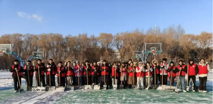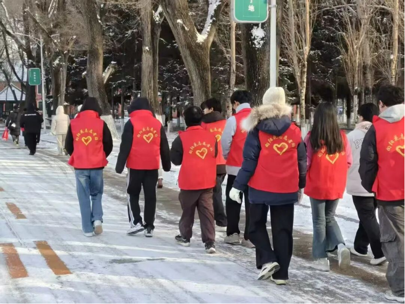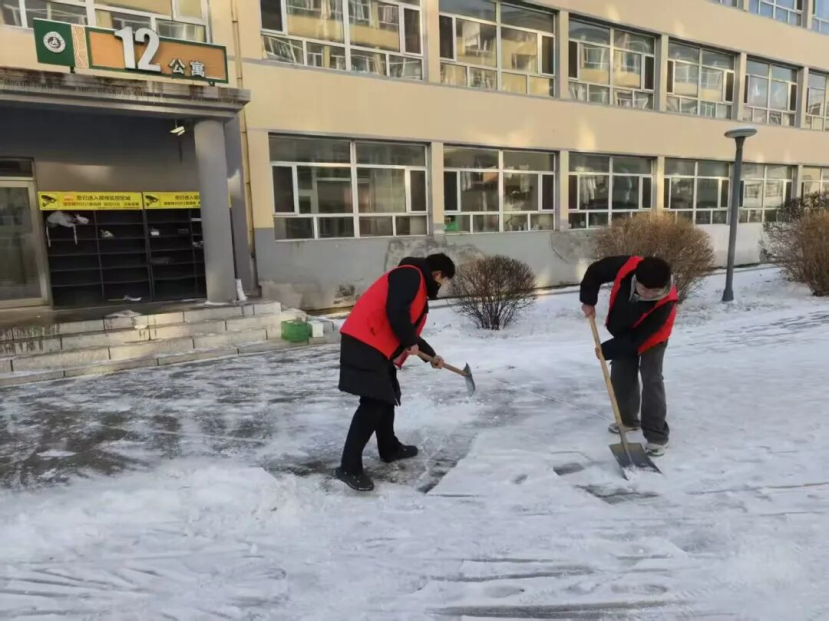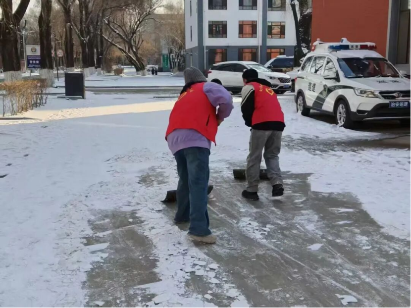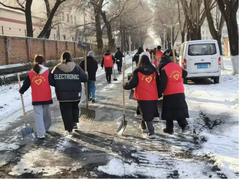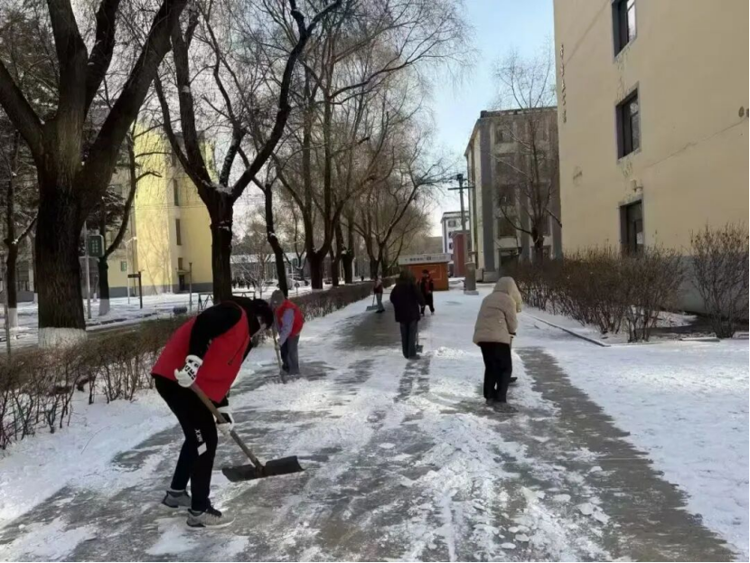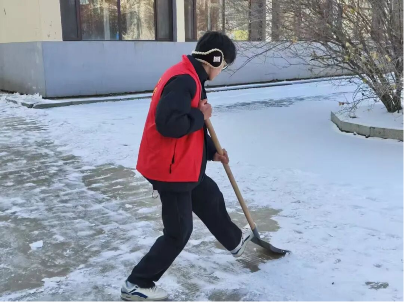 清扫现场,志愿者们顶风冒雪、分工协作、干劲十足。有的挥动铁锹破冰除雪,有的手持扫帚清扫残雪,有的推着推雪板集中清运,大家相互配合、默契十足,不畏严寒、不惧辛劳,用冻红的双手和坚实的脚步,一点点清理着路面的积雪与积冰。重点针对教学楼出入口、食堂周边、图书馆台阶、校园主干道及陡坡等人员密集、通行频繁的关键区域进行精细化清扫,确保不留死角、不留隐患,全力为全校师生铺就一条安全通畅的 “暖心路”,以青春担当筑牢校园安全屏障。