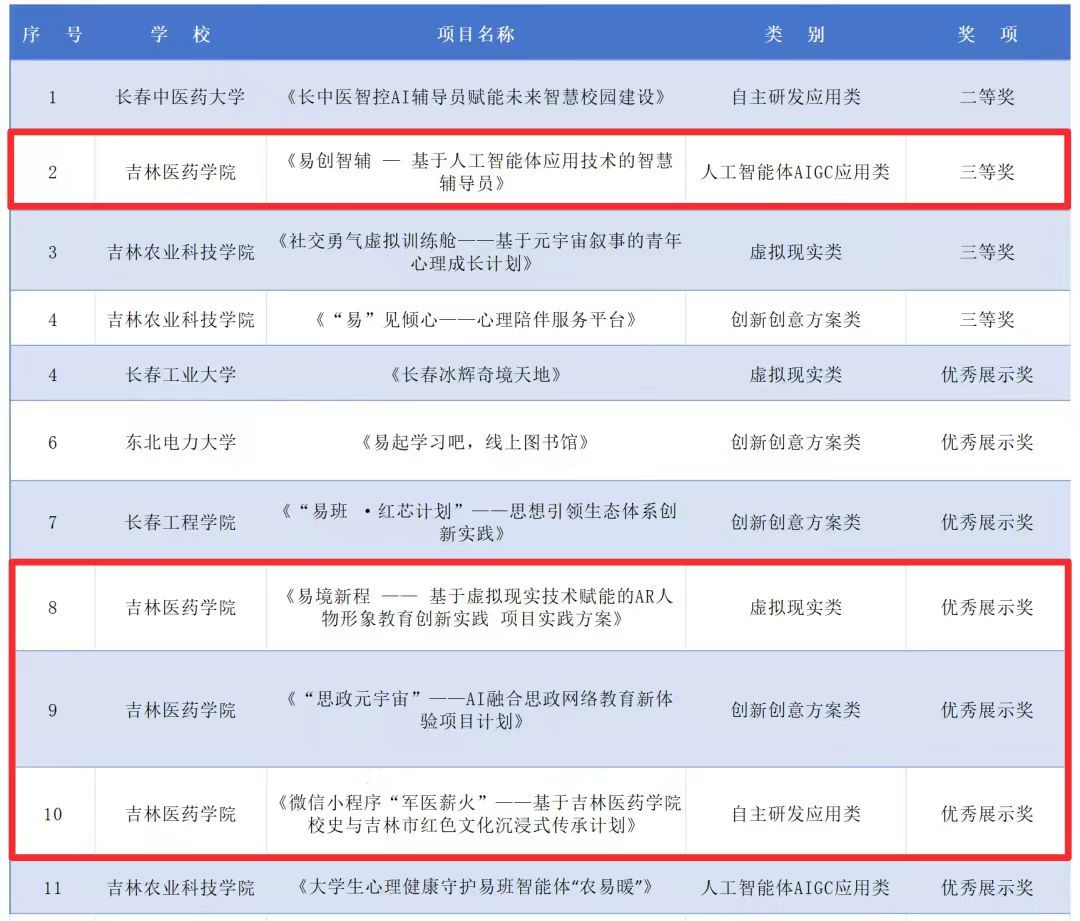 在本次大会中,全省共计6所高校获奖,共计11项,我校参赛成果丰硕,共计获奖4项:《易创智辅—基于人工智能体应用技术的智慧辅导员》荣获2025年易班技术创新大会人工智能体AIGC应用类评比三等奖、《易境新程 —— 基于虚拟现实技术赋能的AR人物形象教育创新实践项目》荣获虚拟现实类优秀展示奖、《“思政元宇宙”—— AI融合思政网络教育新体验项目计划》荣获创新创意方案类优秀展示奖、《微信小程序“军医薪火”——基于吉林医药学院校史与吉林市红色文化沉浸式传承计划》荣获自主研发应用类优秀展示奖。