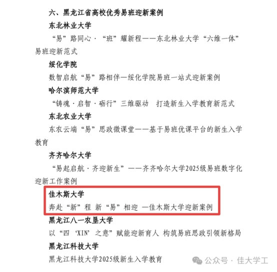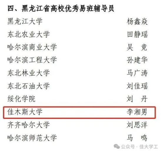 近日,黑龙江省高校易班发展中心公布“2025年度黑龙江省易班共建高校优秀项目”评选结果,我校荣获“黑龙江省优秀易班共建高校”称号,马克思主义学院辅导员李湘男荣获“黑龙江省高校优秀易班辅导员”称号,第八届易班学生工作站站长郎晋辉荣获“黑龙江省高校优秀易班工作站站长”称号,我校共建案例《“易”路向北 红心筑梦——佳木斯大学赋能边疆高校“大思政”育人新生态》荣获“黑龙江省高校优秀易班共建案例”,我校迎新案例《奔赴“新”程 新“易”相迎——佳木斯大学迎新案例》荣获“黑龙江省高校优秀易班迎新案例”称号。