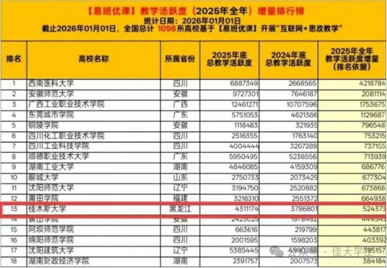 近日,据教育部易班中心发布的“易班优课教学活跃度增量2025年全年总排行榜”,我校以易班优课全年总教学活跃度4311174、全年教学活跃度增量524373的成绩位列于全国第13名、全省第1。