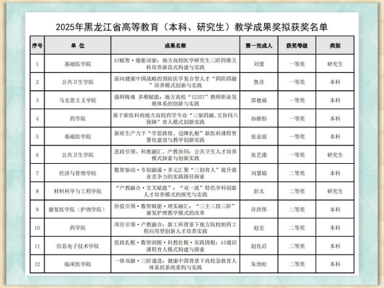 近日,黑龙江省教育厅对2025年黑龙江省高等教育教学成果奖拟授奖成果名单进行了公示。学校在此次评选中再创佳绩,共荣获黑龙江省高等教育教学成果奖12项。其中,一等奖6项(本科4项、研究生2项)、二等奖6项(本科5项、研究生1项),获奖总数与一等奖数量均创学校历史新高。