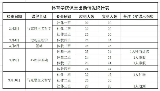 为进一步规范课堂教学秩序,夯实学风建设,切实提升人才培养质量,体育学院对照学校教学质量监控工作要求,结合学生工作常态化课堂督查部署,开展本次课堂学风专项巡查活动。本次重点核查学生课堂出勤、课堂纪律及秩序规范,现将检查结果通报如下。