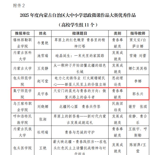近日,由自治区团委主办的2025 年度内蒙古自治区大中小学思政微课作品大赛评选结果正式揭晓。本次大赛设置民族团结类、思政理论类、发展成就类、青春奉献类等多个类别,经审核推报、集中评审等环节,最终共评选出优秀微课作品60件,其中高校学生组11件。我校马克思主义学院学生吴宇春在指导教师郭永兴的悉心指导下,其微课作品《天安门的晨光与青春的方向:做复兴路上的奋斗者》获评“高校学生组青春奉献类”优秀作品。