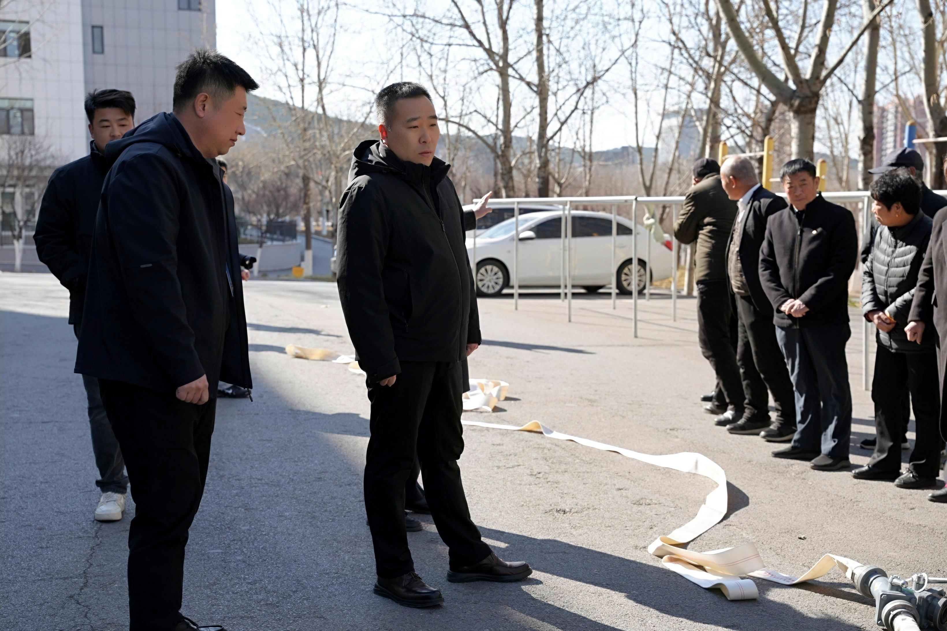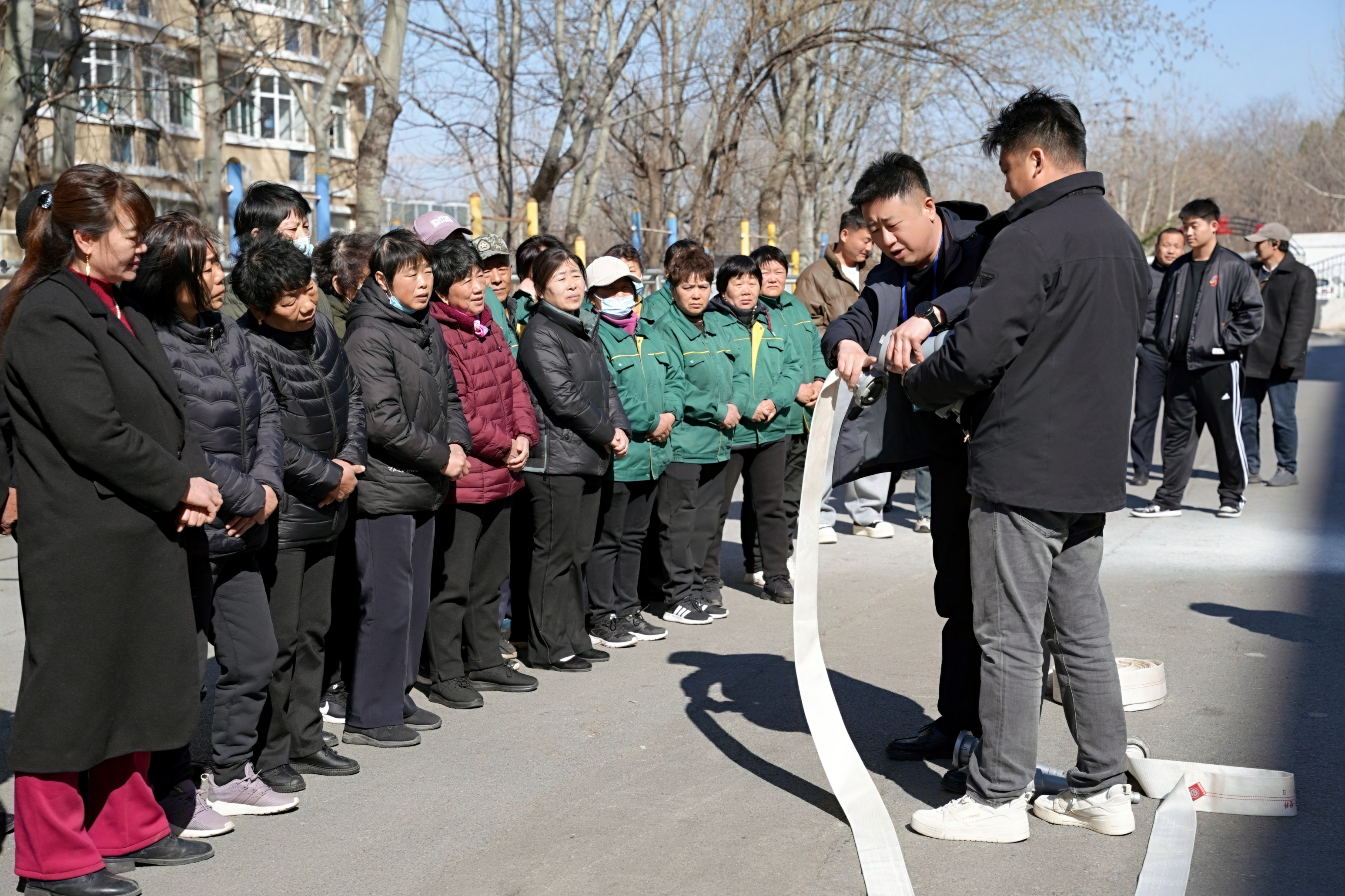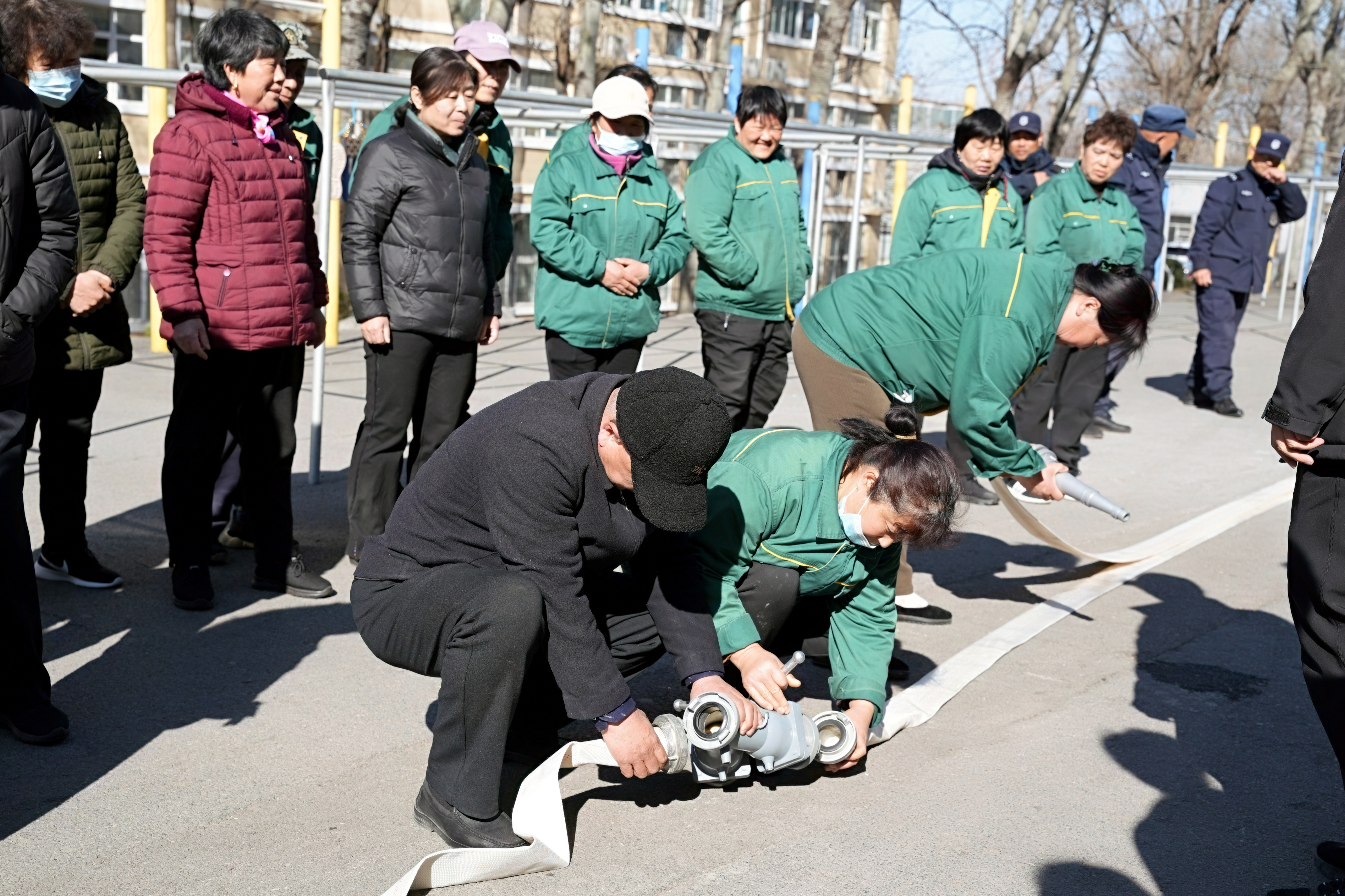 示范操作讲解结束后,全要素实战演练正式展开。全体公寓管理人员积极参与实战演练,上手操作消防设施。先是单人练习,熟悉消防水带的展开、连接、喷水等单个动作技巧,随后两人一组进行协同作战模拟,一人负责连接水枪并到达起火位置,一人负责连接水阀并打开水阀,动作愈发娴熟流畅,达到了应急演练的预定目标。