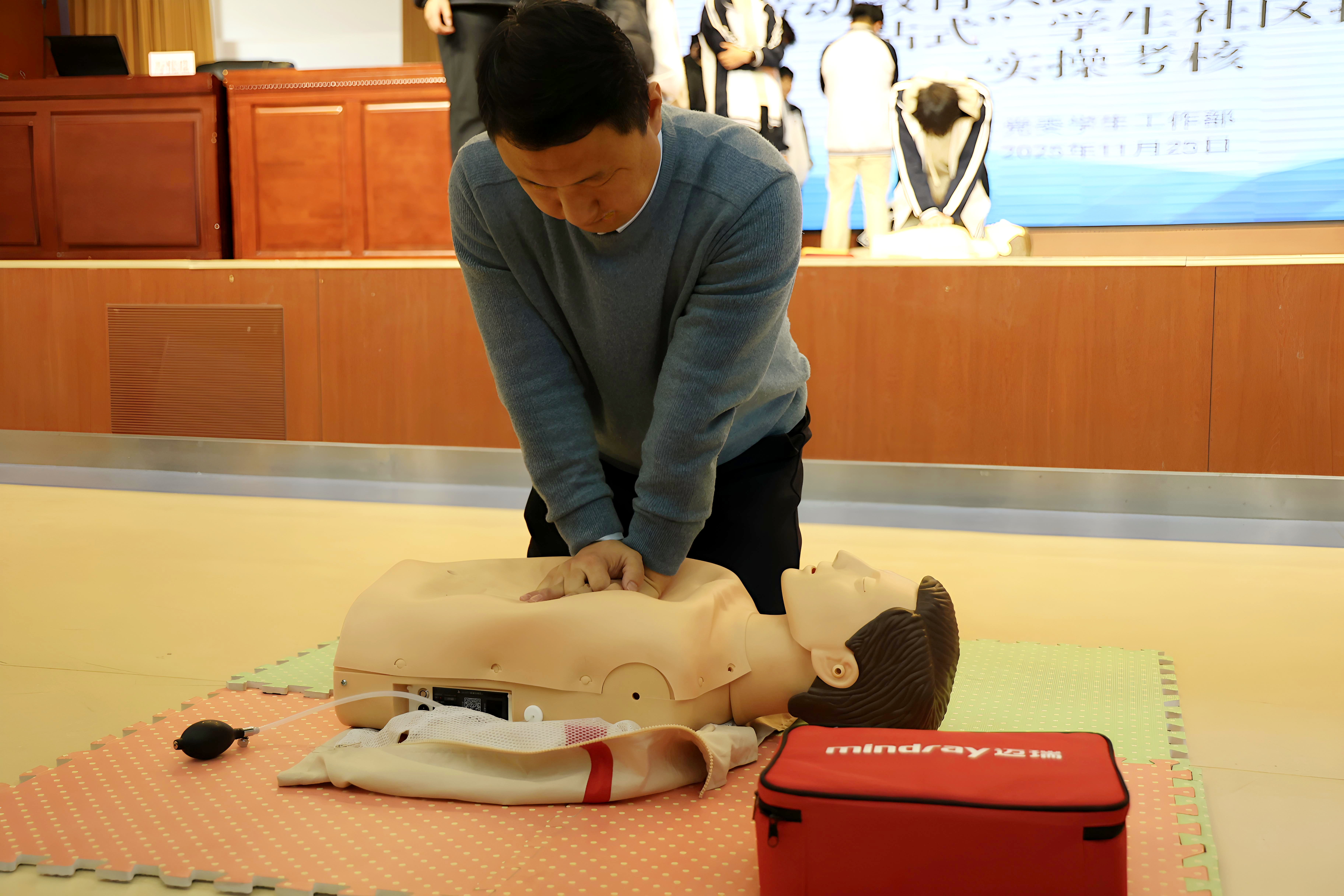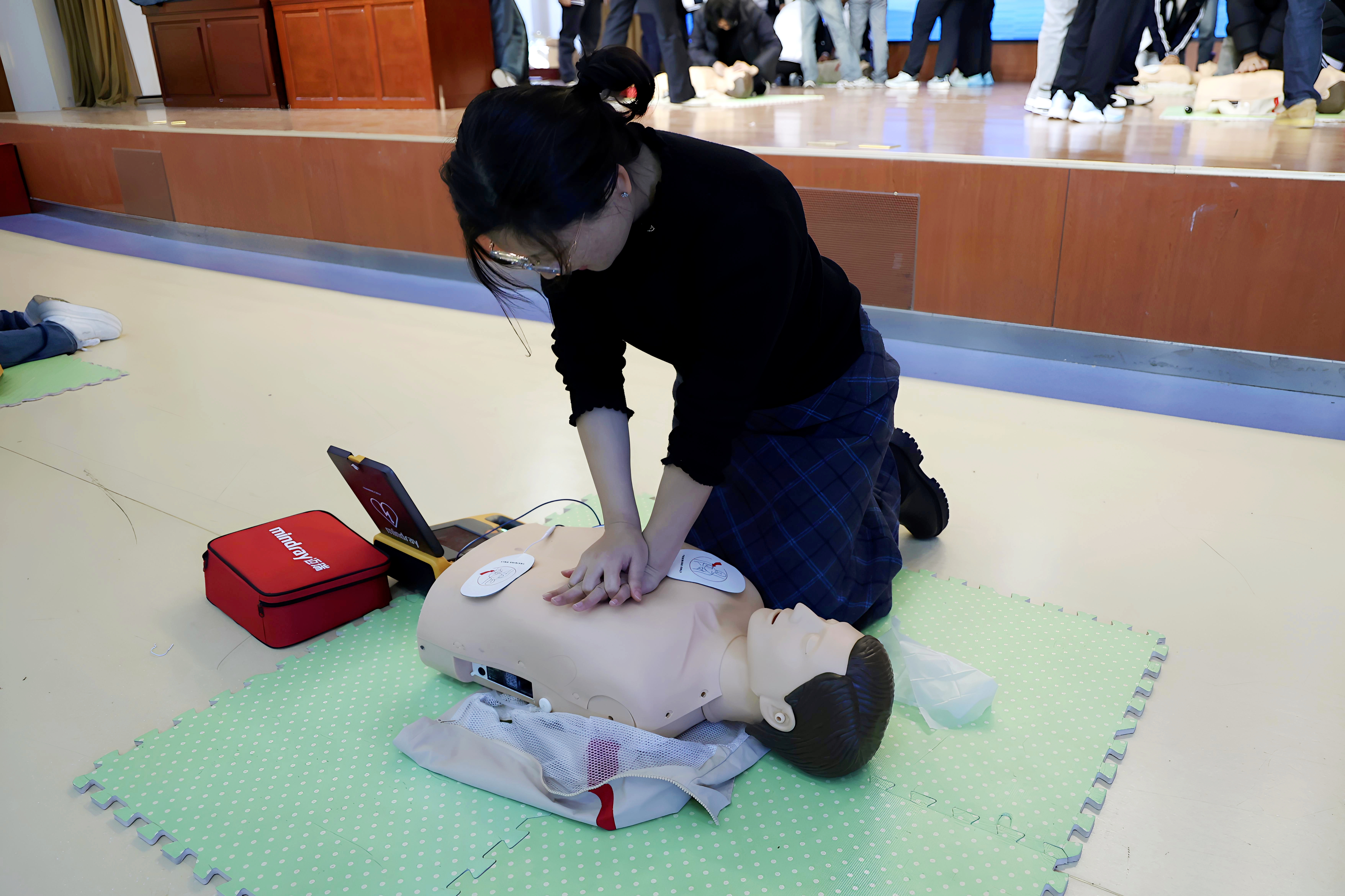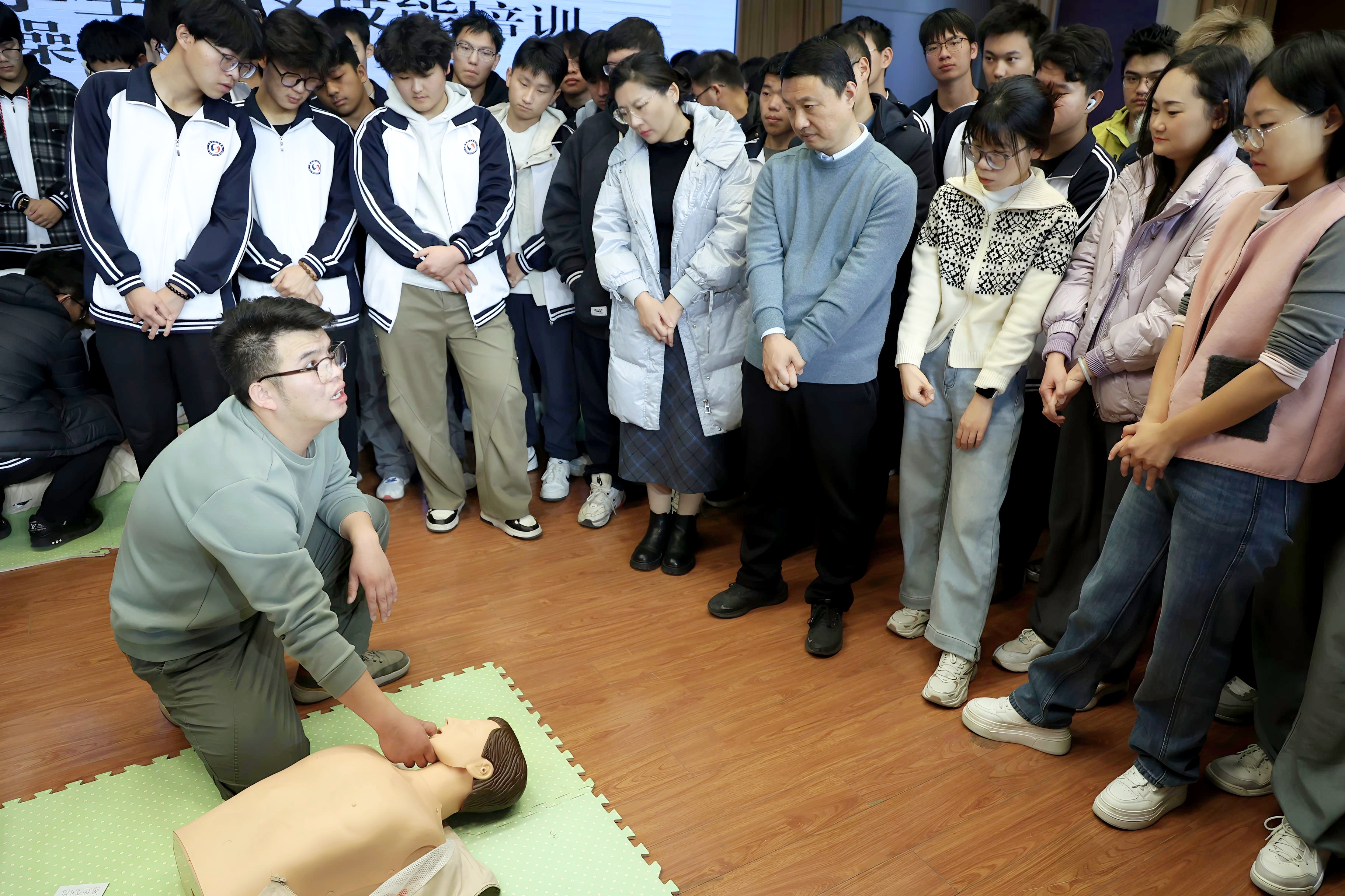 两期培训分别邀请济南市历城区红十字会讲师原阔、天桥区红十字会讲师万悦瑞授课。学院安全保卫处副处长张宁、党委学生工作部副部长金鑫到场指导,学前教育系学办主任董芳带领系部2025级师生、中德技术系2025级师生及部分劳动教育课程教师共480余人参训,两系辅导员老师全程协助培训组织、实操指导等工作。培训聚焦心肺复苏(CPR)、自动体外除颤器(AED)使用等核心技能,通过“理论+实操+考核”模式,全员顺利通过考核,熟练掌握关键救护技能。培训期间,张宁建议进一步加大实操演练比重、丰富应急救护培训内容,助力师生掌握更多实用急救技能,提升培训实效。