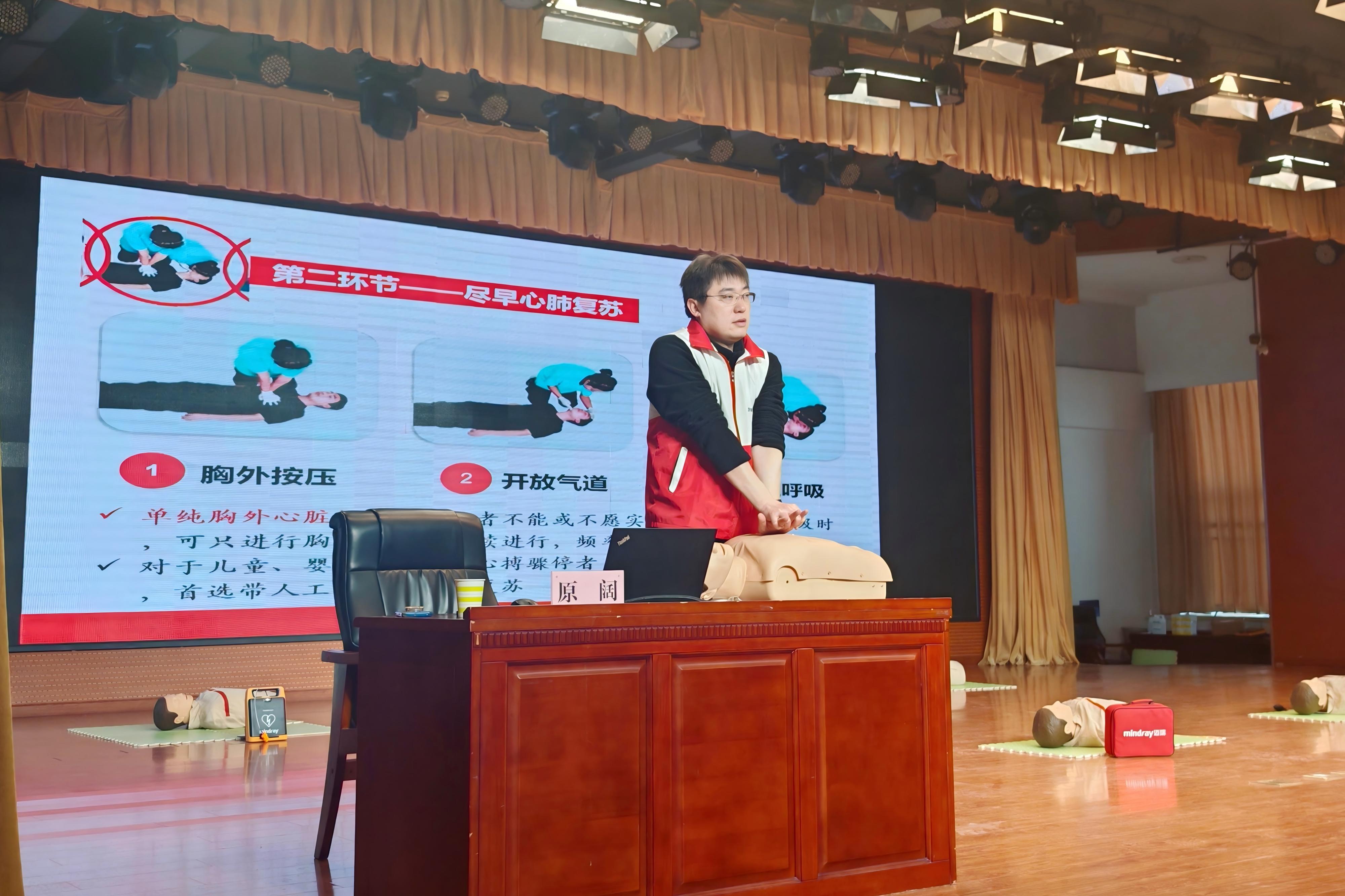 培训中,原阔介绍了红十字会的职责使命与核心宗旨,系统讲授了心肺复苏(CPR)原理、自动体外除颤器(AED)规范操作、气道异物梗阻急救方法以及地震等突发灾害的应急避险措施。课程重点聚焦心搏骤停的快速识别与规范施救流程等关键内容,通过理论讲解与现场示范相结合的方式,确保学员精准掌握急救关键环节。理论教学结束后,学员在讲师与助教的一对一指导下,分组进行心肺复苏与AED使用的模拟实操演练。通过反复演练与即时纠偏,全体学员顺利通过标准化考核,切实巩固学习成效,强化应急救护实战能力。