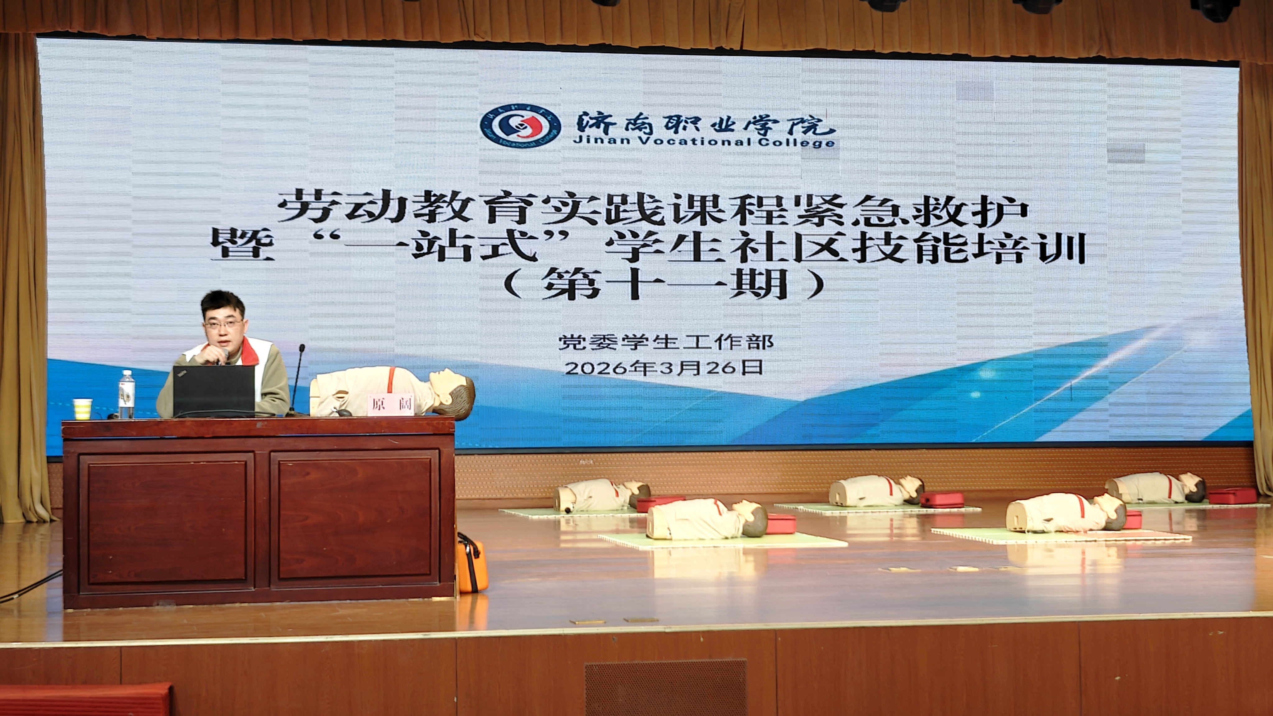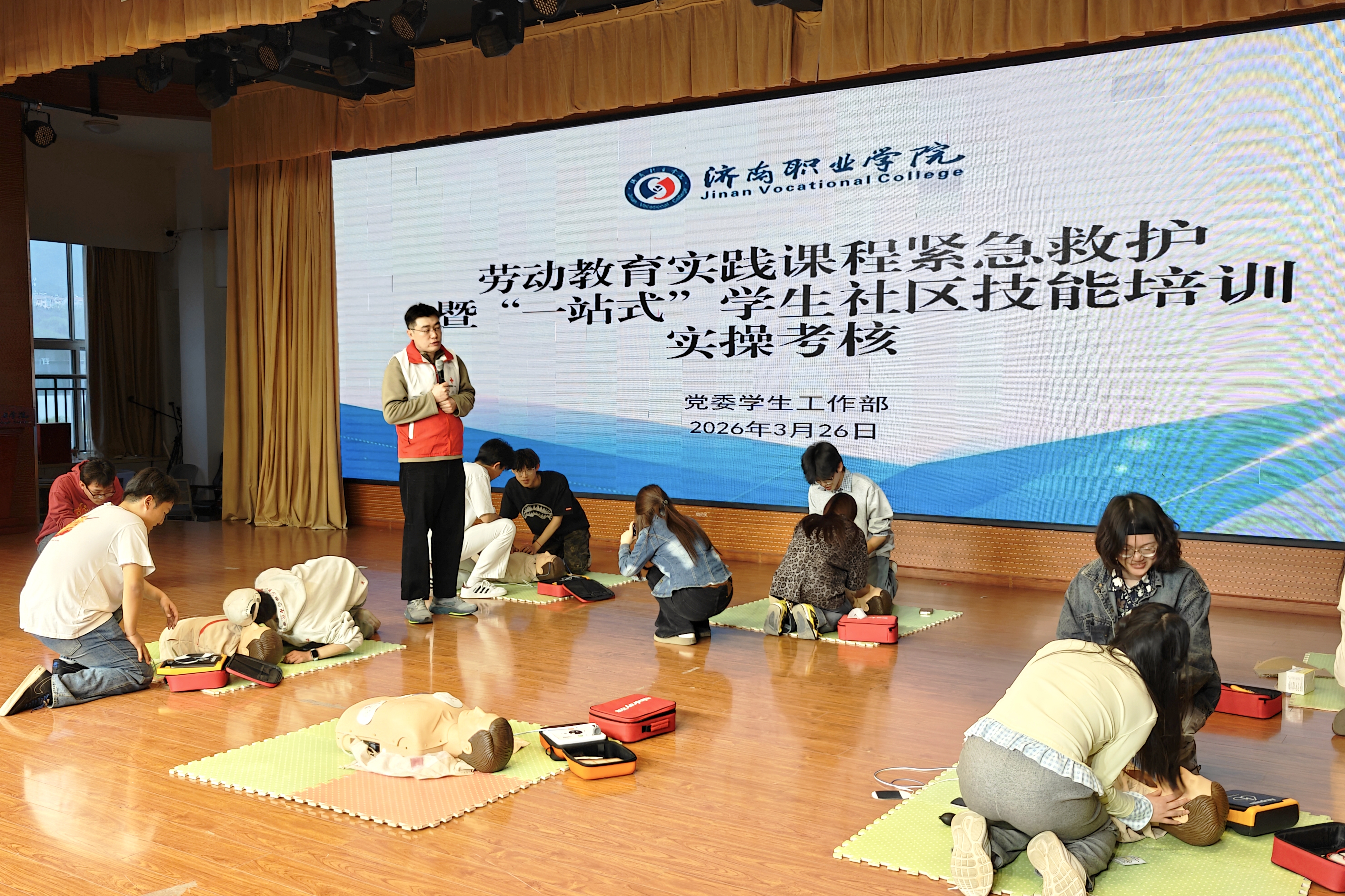 为深入贯彻落实立德树人根本任务,践行“人民至上、生命至上”理念,切实提升广大师生应对突发事件的应急处置与自救互救能力,学院将应急救护技能培训有机融入劳动教育实践与“一站式”学生社区建设体系。3月26日至27日,由党委学生工作部统筹组织的劳动教育实践课程紧急救护暨“一站式”学生社区技能培训(第十一、十二期)在惟实楼风华堂顺利开展。本次培训聚焦心肺复苏等关键救护技能,特邀济南市历城区红十字会专业讲师原阔及助教姜浩现场授课,计算机系、文化传播与艺术管理系2025级共540名学生全程参与并通过考核。