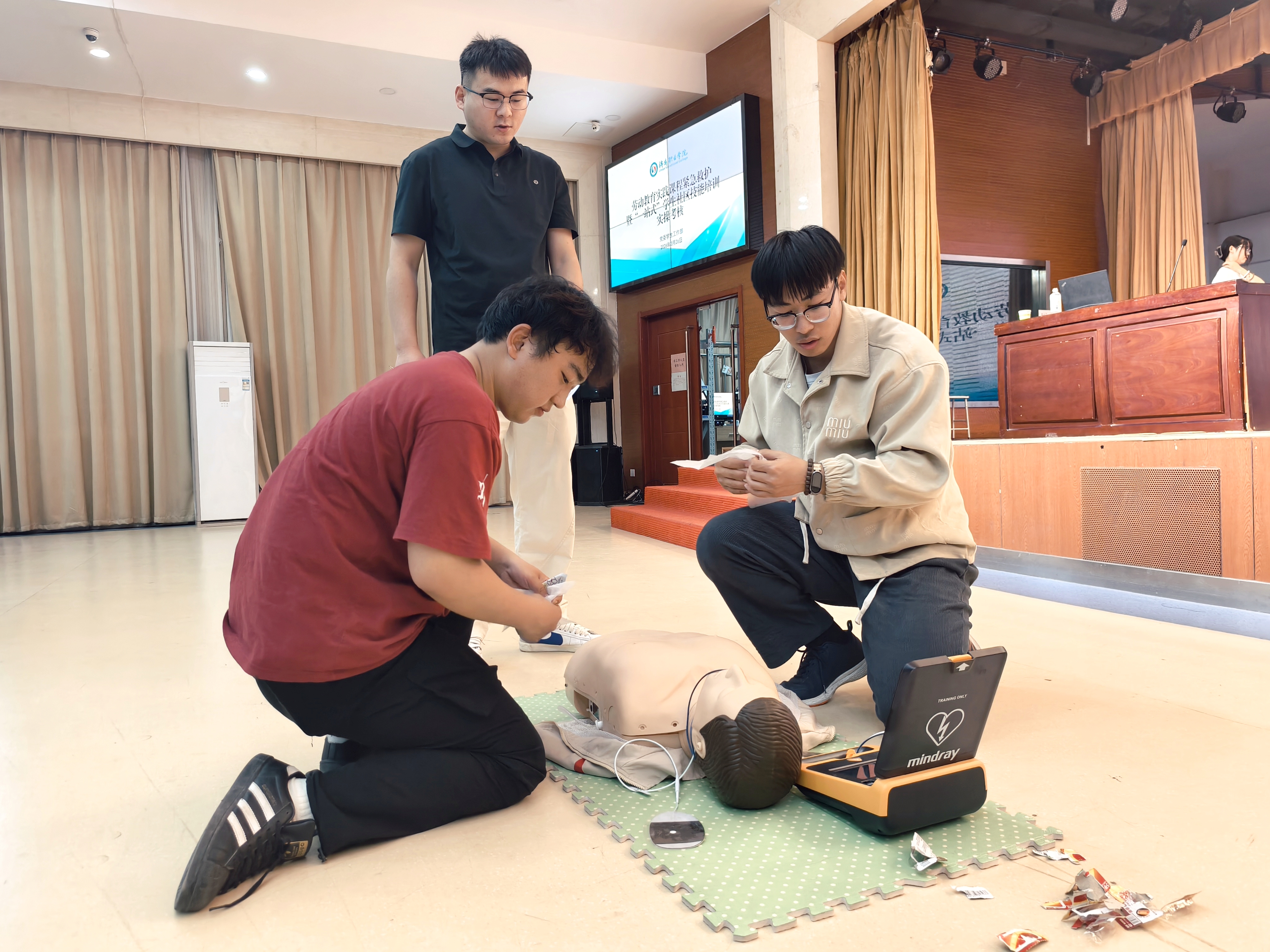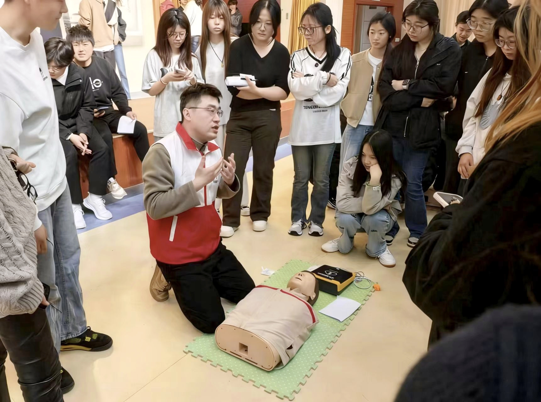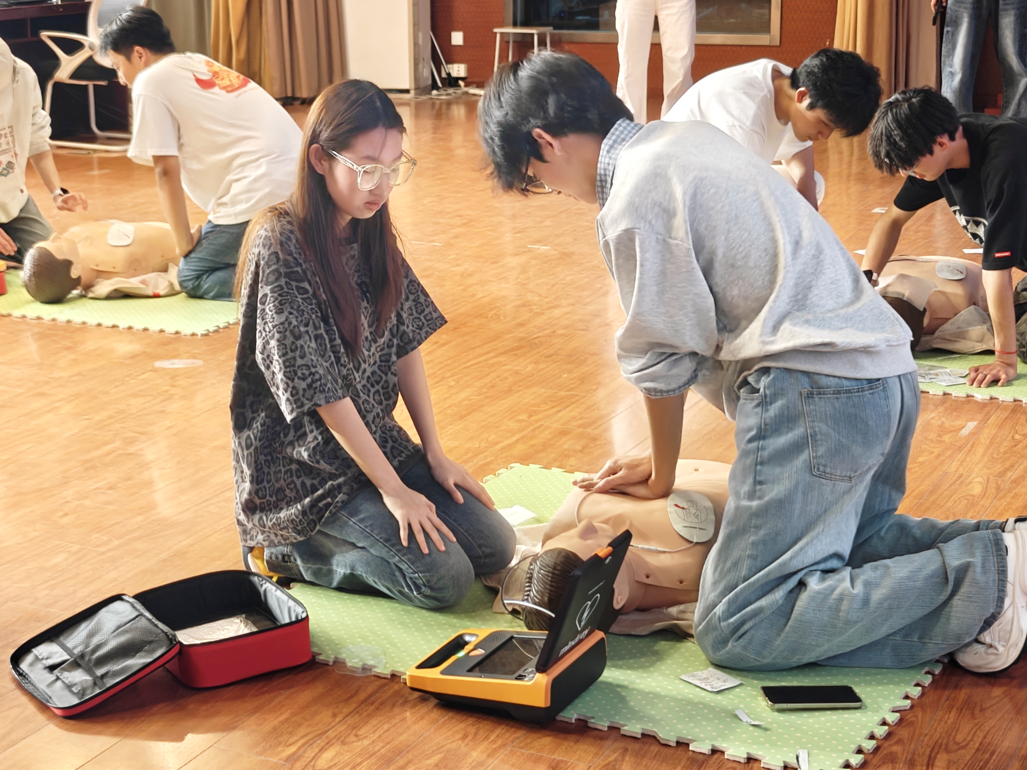 培训紧扣心搏骤停“黄金4-6分钟”抢救时间窗,系统讲解应急救护知识体系与操作流程,重点涵盖心肺复苏标准化步骤、自动体外除颤器(AED)使用要领及气道异物梗阻现场急救方法等内容。讲师通过真实案例解析与差异化演示,清晰阐明不同人群的救护要点。在讲师、助教及启明星应急救护社团成员的共同指导下,参训学生利用模拟教具反复操练胸外按压、人工呼吸等关键技能,确保动作规范、技能扎实。