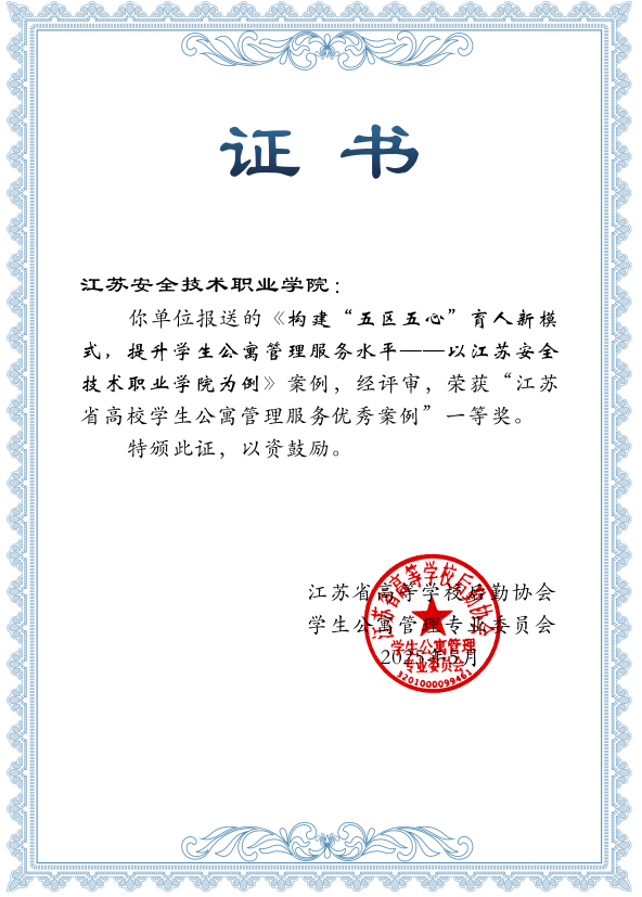近日,由江苏省高等学校学生公寓管理专业委员会主办的“高校学生公寓管理服务优秀案例”征集活动评选结果揭晓,经自主申报、材料审核、专家评审等程序,我校推荐的案例《构建“五区五心”育人新模式,提升学生公寓管理服务水平—以江苏安全技术职业学院为例》获评江苏省高校学生公寓管理服务优秀案例一等奖。