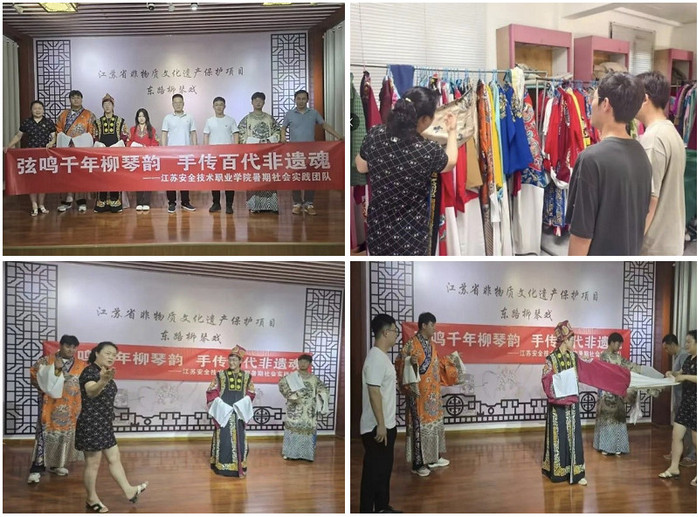 工业安全与职业健康学院 “柳韵传薪”暑期社会实践团聚焦江苏省省级非物质文化遗产——新沂柳琴戏,展开了一场深入的非遗文化探寻之旅。实践团在新沂柳琴剧团老师的悉心讲解与专业指导下,了解柳琴戏的起源与发展,;剧团老师邀请实践团成员穿上演出服饰,登上舞台,耐心细致地讲解戏曲的基本动作,在舞台上,成员们分饰角色,深刻体会到了戏曲表演的艰辛与不易。本次实践带回的不仅是对 “拉魂腔”的记忆,更带着亲手记录的戏服图谱、演员口述的表演要诀,这些都将成为 “非遗进校园”活动的鲜活素材。