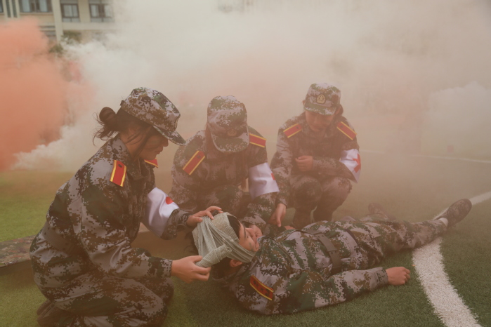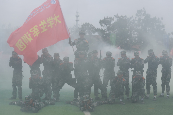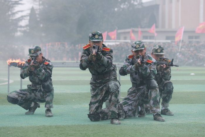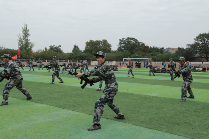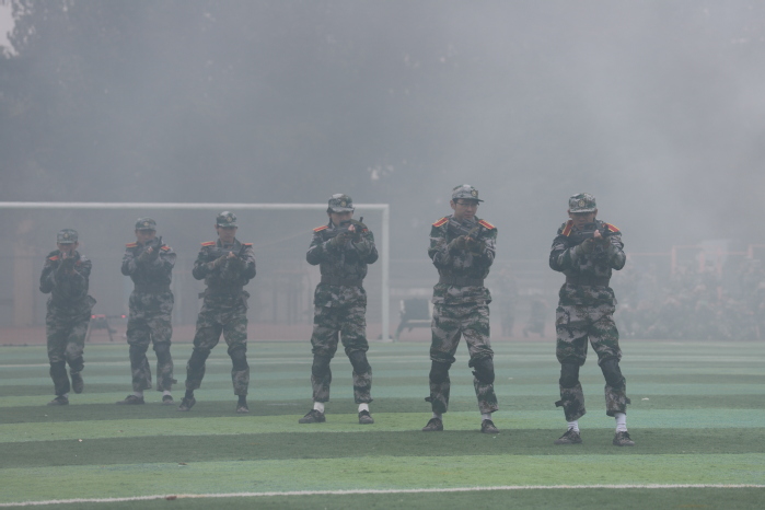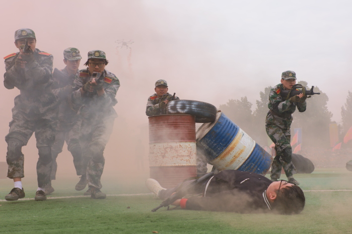 战术表演中,同学们运用战术队形进行作战演练,在模拟战场环境下进行接敌运动、搏斗杀敌、夺取阵地,将军训成果汇报表演推向高潮,充分展示了同学们良好的综合素质和朝气蓬勃、积极向上的精神风貌。