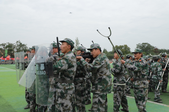 在军事科目表演环节,气势雄壮的刺杀操、刚劲有力的军体拳、英姿飒爽的匕首操、处置果断的校园反恐演练,一招一式尽显斗志昂扬,赢得全场师生的阵阵掌声。