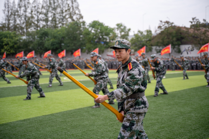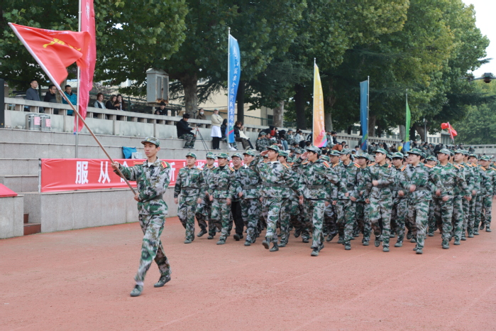 大会在雄壮的国歌声中拉开帷幕。各营连方阵依次走过主席台接受检阅,同学们步伐整齐、精神抖擞、口号响亮,动作规范有力,充分展现了军事训练所培养出的扎实素养与严谨作风。