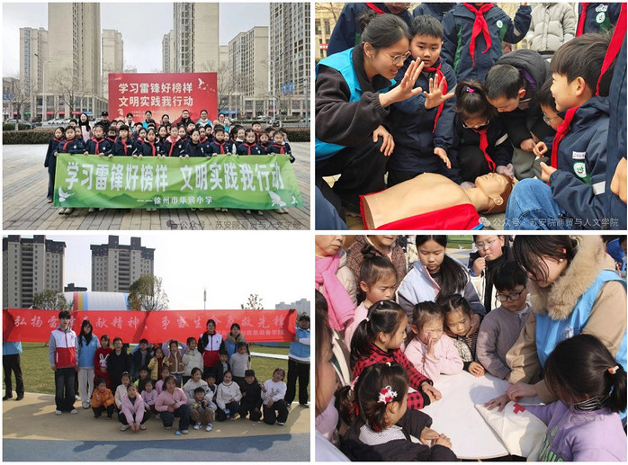 各二级学院联动属地街道、学校、机构等实践共建基地,开展形式多样的文明实践活动,推动雷锋精神融入基层、深入人心。商贸与人文学院联合云龙区翠屏山街道办事处云和社区、徐州市华润小学及辖区各单位,开展“学习雷锋好榜样,文明实践我行动”主题活动。志愿者现场演示急救操作、普及消防知识,引导儿童沉浸式体验灭火器使用,筑牢社区安全防线。智能制造与应急装备学院联合贾汪区体育馆,开展应急救护演练志愿活动,通过知识科普、设备讲解、趣味问答及实操演练等形式,让市民在互动参与中掌握急救技能。