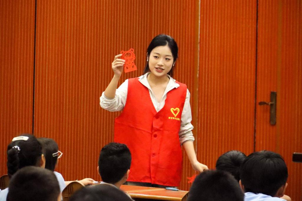 传承非遗文化,感受指尖魅力。“小朋友们,剪纸是我国的传统民间艺术,一把剪刀、一张纸,就能创造出奇妙的图案。”在“小老师”们的讲解下,孩子们对剪纸艺术产生了浓厚的兴趣。在实际操作过程中,孩子们认真地跟着“小老师”学习折纸、画样、裁剪等。虽然动作略显生疏,但专注的神情令人动容。志愿者们穿梭在孩子们中间,手把手地纠正他们的姿势,鼓励他们大胆创作。不一会儿,一张张彩纸在孩子们的手中变成了栩栩如生的小动物、形态各异的花朵。看着自己的作品,孩子们脸上洋溢着自豪的笑容,非遗文化的魅力也在这一折一剪间得到了传承。