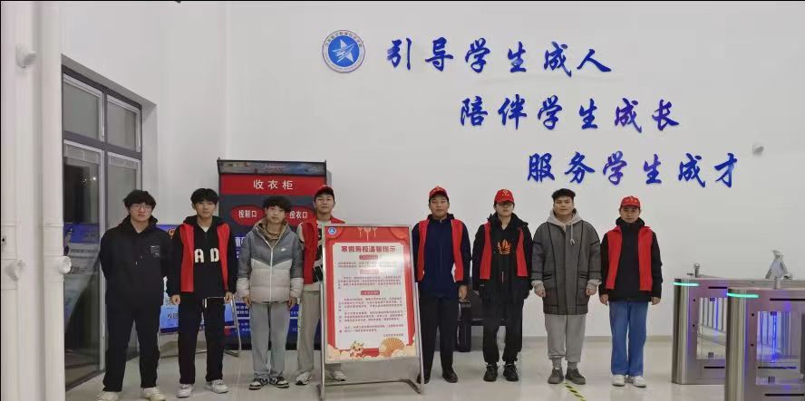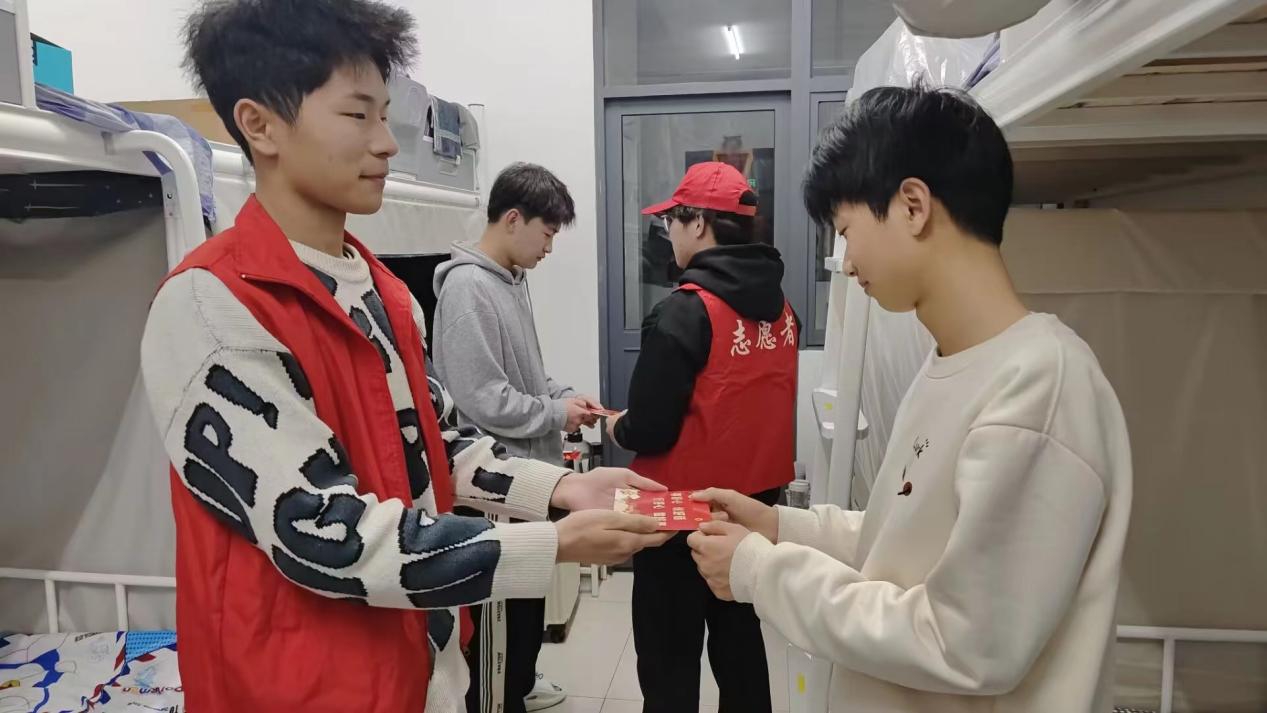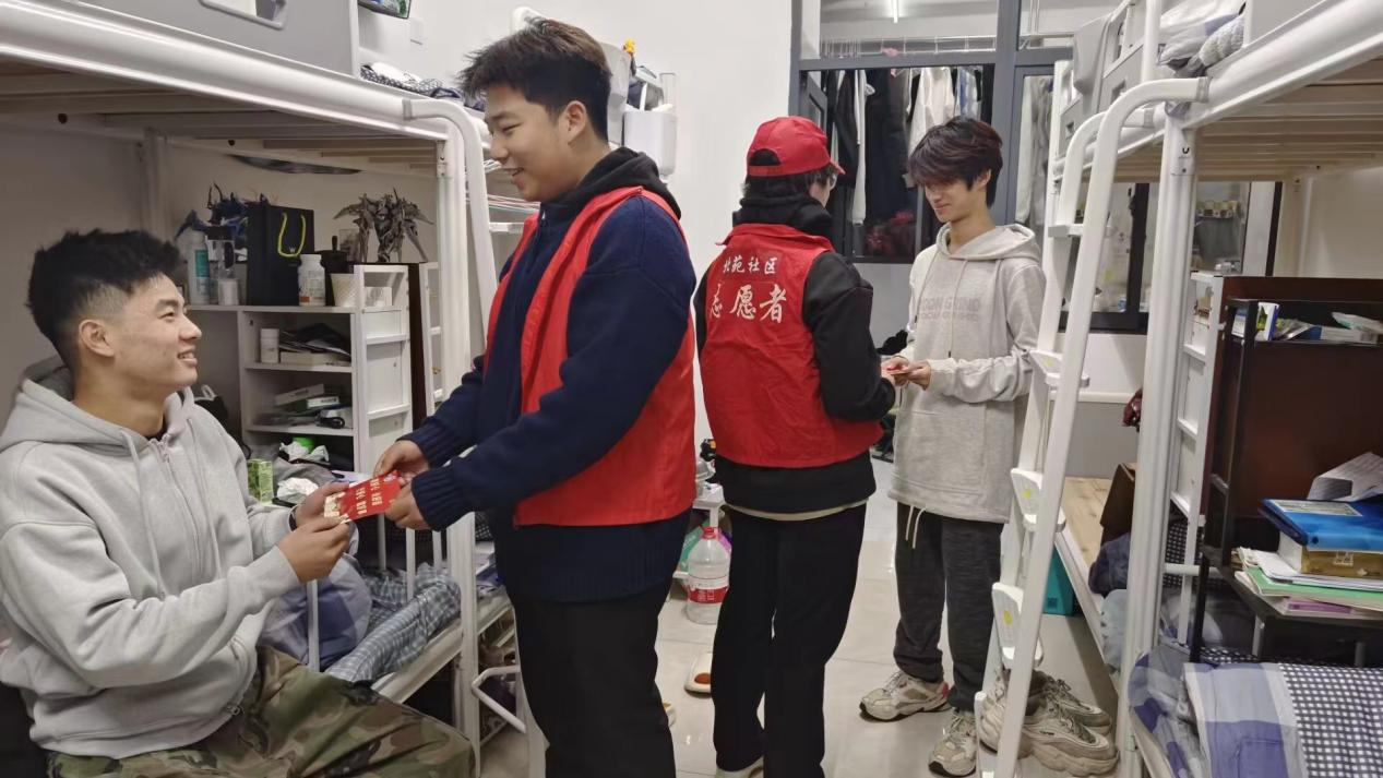 北苑社区辅导员徐铖和航空工程学院学生分会几名成员面对北苑社区6、7、8号楼的学生发放寒假离校温馨提示卡。