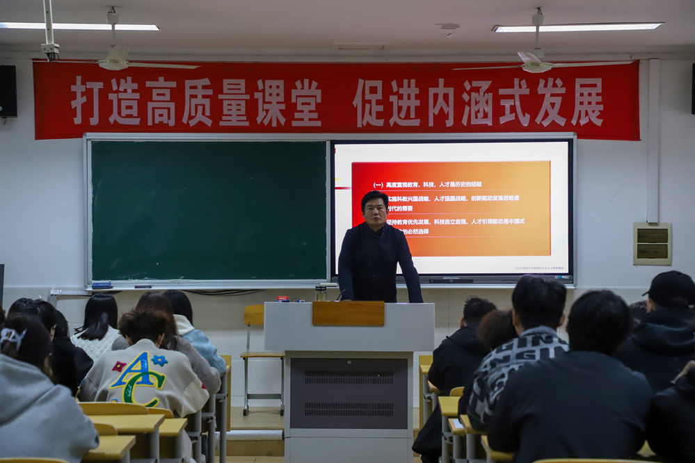 课堂上,高尚兵深入讲授了《习近平新时代中国特色社会主义思想概论》中“社会主义现代化建设的教育、科技、人才战略”这一重要专题。课程伊始,他结合党的二十大报告以及习近平总书记的经典论述,深入阐释了教育、科技、人才之间相辅相成、循序递进的内在逻辑关系,为学生搭建起系统的理论框架。随后,他重点围绕加快建设教育强国、科技强国以及实施新时代人才强国战略的重大意义和具体路径展开详细讲解,引导学生深刻领会国家发展战略的深远意义。