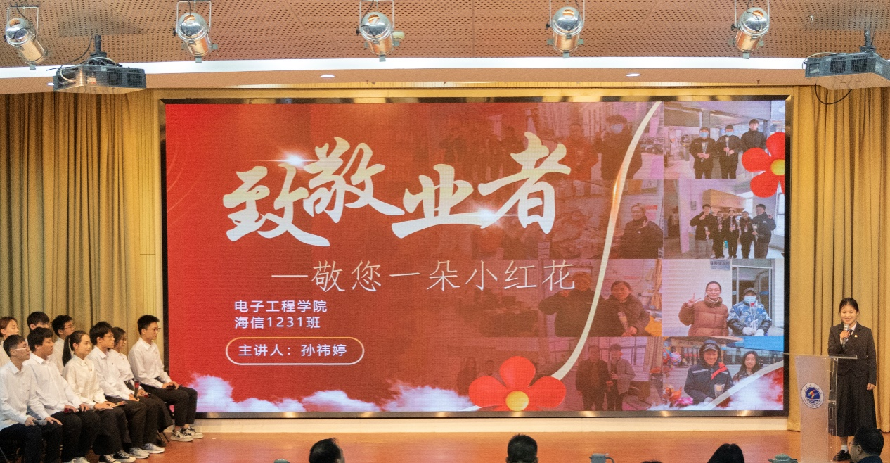 应用技术学院财务3232班以国旗为帜,讲述守岛英雄王继才夫妇的故事,以拳拳赤子心感召青年从个人做起,践行爱国主义。机械工程学院机电1231班深刻阐释国家富强对保障人民福祉的关键作用,呼吁青年一代应以奋斗姿态在国家发展的浪潮中乘风破浪。环境与化学工程学院化工1241班上演短剧《救赎》,强调反对校园霸凌,催化“友善反应”,做友善的传播者,为构建和谐校园贡献青春力量。海洋科学与水产学院生技1232班借电影《哪吒》相关片段,以角色扮演的方式探讨社会主义核心价值观中自由的真谛。电子工程学院海信1231班以敬业为主题,拍摄短视频《送你一朵小红花》,歌颂平凡岗位里的动人事迹,礼赞烟火人间里隐匿光芒的平凡英雄。海洋工程学院海资1241班讲述黄旭华投身核潜艇研发事迹,模拟跨时空对话,诠释敬业精神,激励学子坚守奉献,推动社会发展。