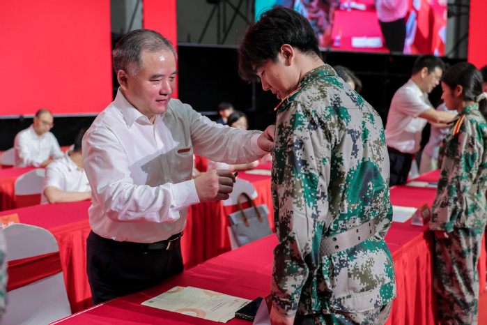 典礼上,全体校领导为2025级新生代表佩戴校徽。愿同学们以校徽为荣,努力拼搏,为校徽增添新的光彩。