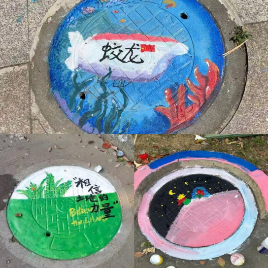 活动现场,同学们以6-8人为一组,热情高涨,通力合作,原本灰暗单调的井盖摇身变为色彩斑斓的“艺术品”:学校的吉祥物、国宝熊猫、卡通海豚、色彩斑斓的转盘、小王子……每一幅作品都传递着共建绿色家园的理念。为突出学院特色,同学们还绘制了蛟龙号。这些作品展现了同学们的创造力和想象力,推进了校园文化与环境建设深度融合。