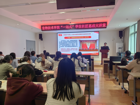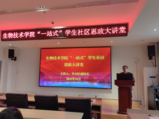 为深入学习领会党的二十届四中全会精神,进一步提升学生党员政治理论素养,引导学生将国家大政方针与个人专业学习、职业规划相结合,2025年10月30日,校党委常委、副校长李木旺走进生物技术学院“一站式”学生社区思政大讲堂,带领全体学生党员一起学习了党的二十届四中全会公报。