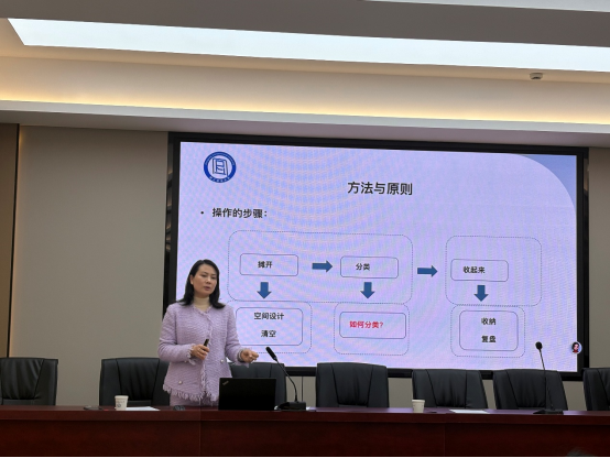 接着,由本次会议特别邀请的专业收纳师陈竹华对参与会议的学生进行理论培训,围绕空间利用最大化、物品分类可视化、取用便捷化的核心原则,精准分析大学生宿舍收纳的常见痛点,分享 “断舍离”、分类收纳、区域规划等实用方法,细致讲解分层架、收纳盒等宿舍适配收纳工具的使用场景与技巧,并设置互动答疑环节,针对性解决同学们提出的各类宿舍收纳难题。