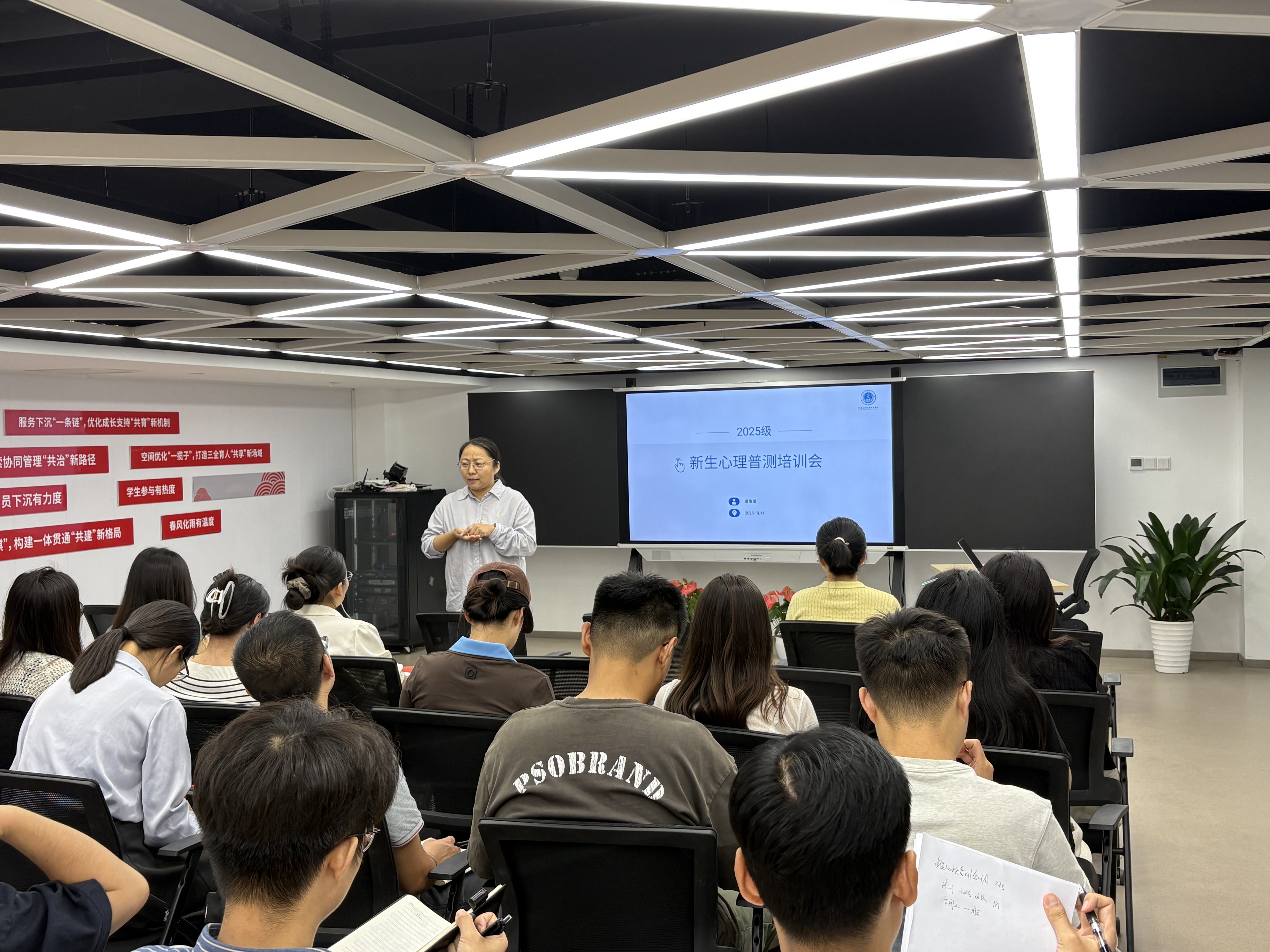 本次普查由心理中心统筹安排并组织实施。董甜甜老师重点讲解示范了新生心理普查工作的操作流程、测评量表以及注意事项等,明确规范要求,并现场解答提问。