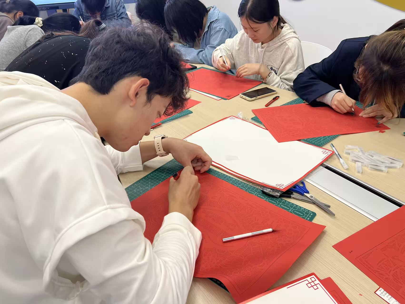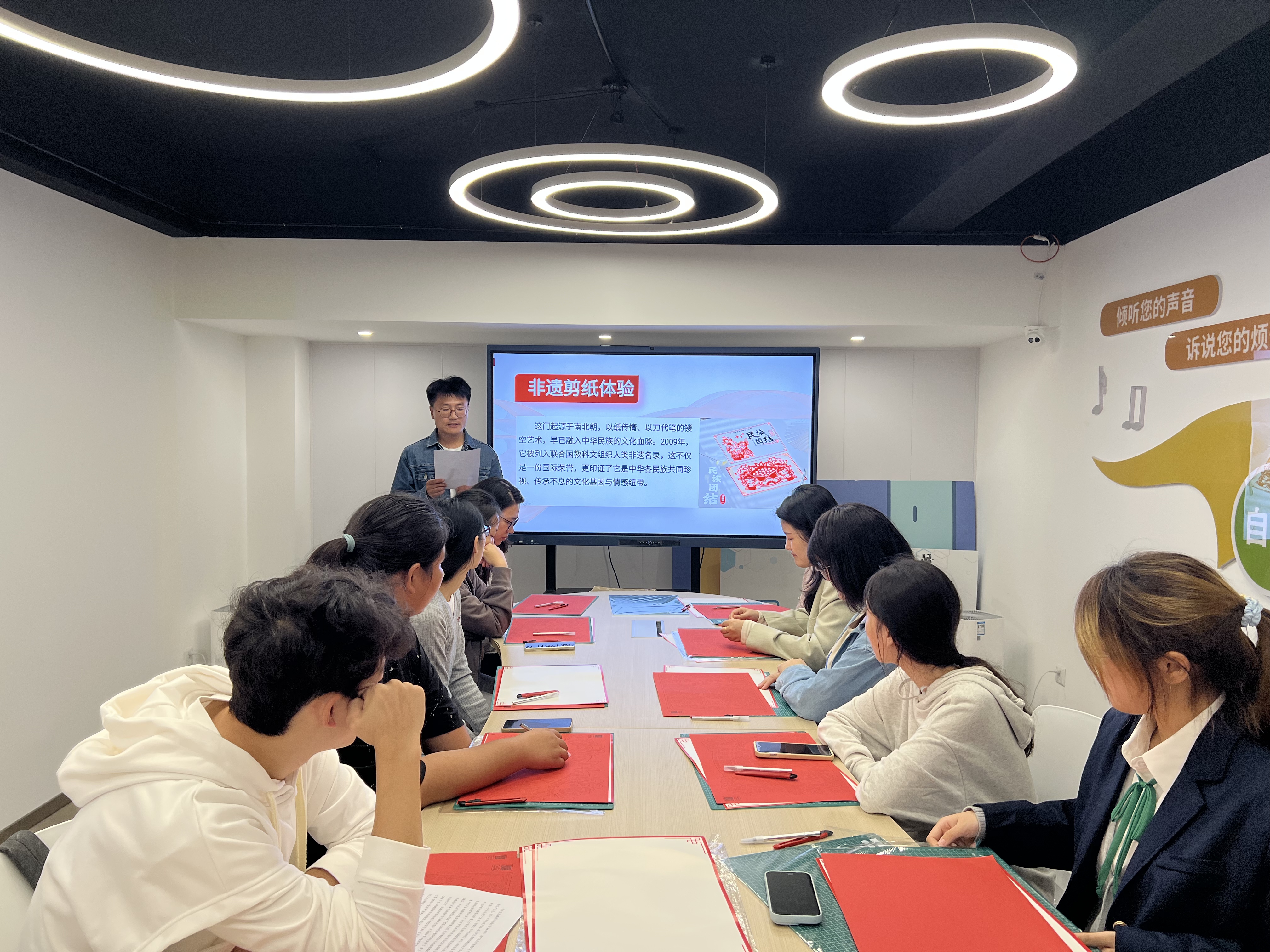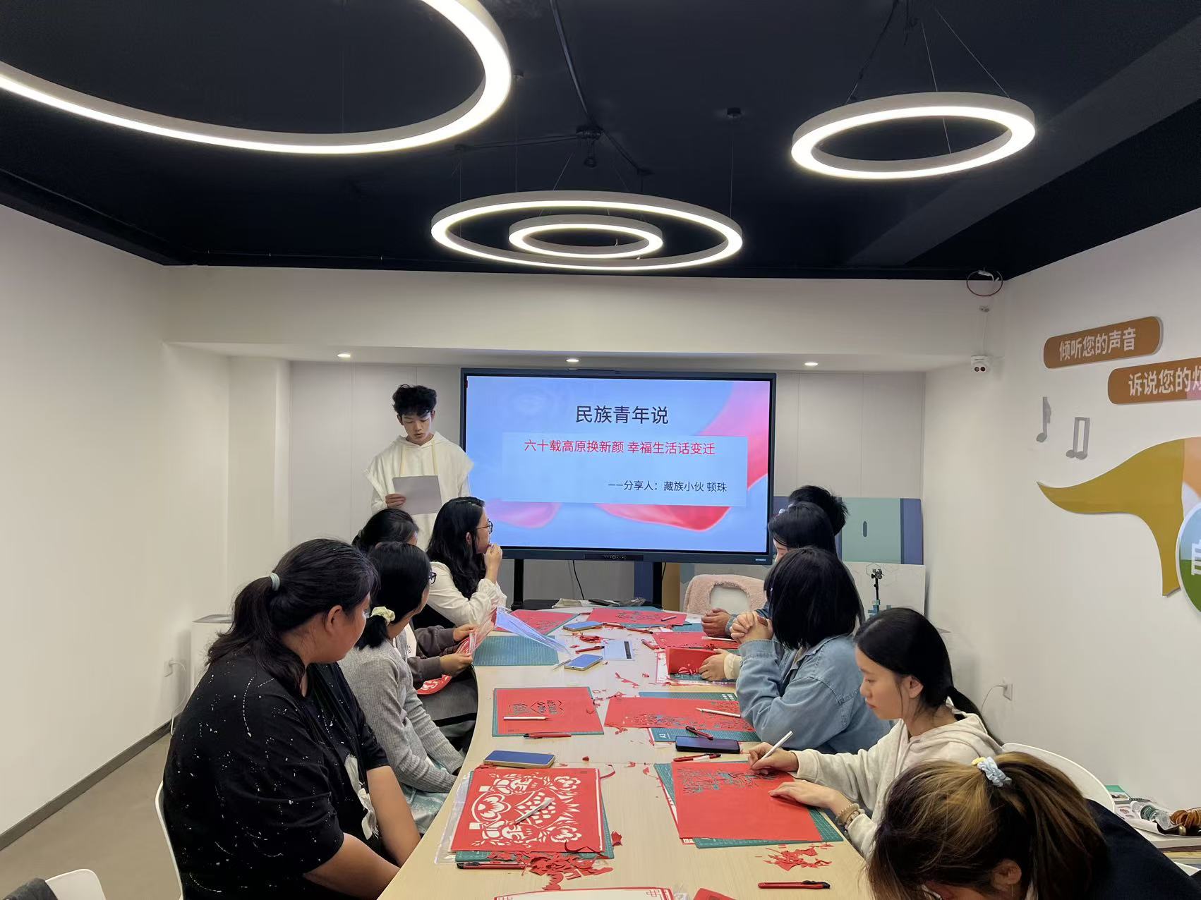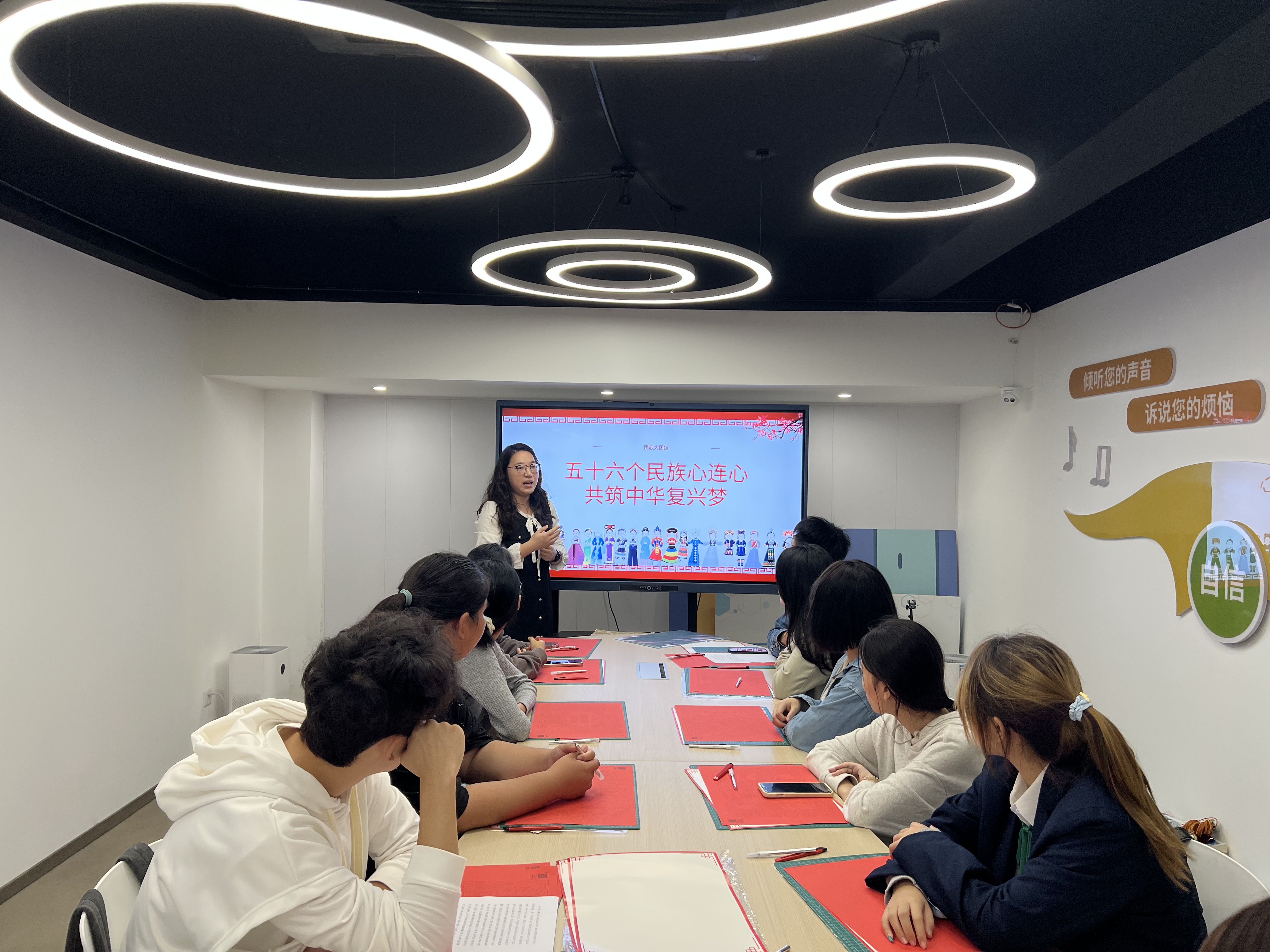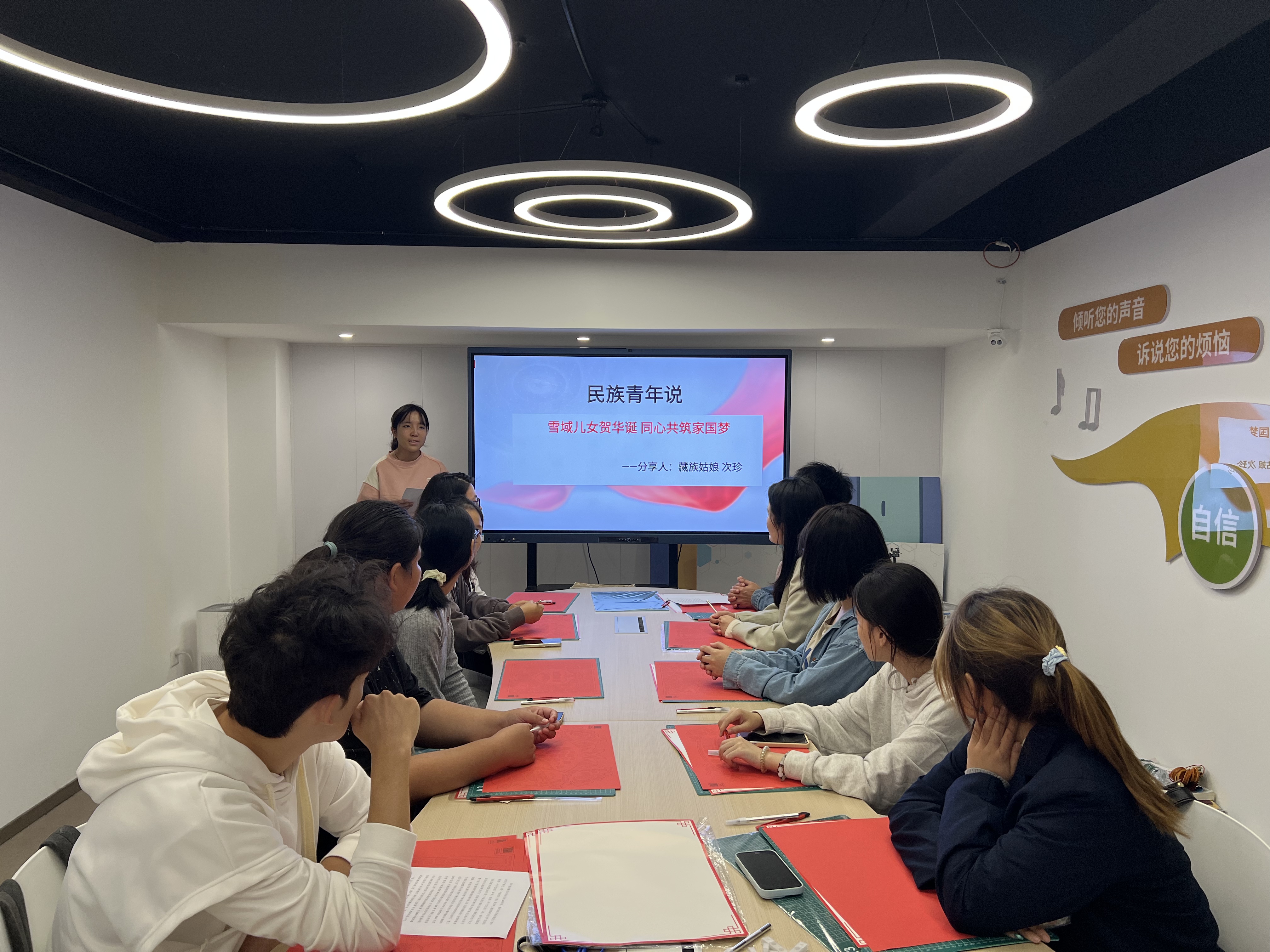本次主题思政课巧妙构思了层层递进的三个教学环节。在“民族初心讲”环节,苏琪老师以《五十六个民族心连心 共筑中华复兴梦》为题展开现场教学,系统梳理从“中华民族”概念到“中华民族共同体”,再到“铸牢中华民族共同体意识”的理论发展脉络,深刻阐释其本质内涵,并结合当前形势重点论述了做好此项工作的极端重要性,为同学们奠定了坚实的理论基础。在“民族匠心剪”环节,葛晓磊老师引导师生共同步入非遗剪纸的艺术殿堂。通过讲解剪纸的历史传承与镂空雕刻技艺,参与者得以沉浸式感受中华优秀传统文化的独特魅力。在“民族青年说”环节,特邀藏族学生次珍与顿珠分享家乡故事。次珍同学以“国庆里的藏族味儿”为题,生动描绘了五星红旗与五彩经幡交相辉映、人们盛装参与“林卡”聚会、跳起欢快锅庄、品味特色美食的节日盛景,展现了传统与现代交融的独特庆祝方式。顿珠同学则围绕西藏自治区成立60周年的主题,分享了家乡在基础设施、民生改善、文化传承与生态保护等方面的深刻变迁,以其亲身感受印证了在党的坚强领导下雪域高原谱写的发展奇迹。两位学生的真诚分享,引发了在场师生的强烈共鸣与深入思考。