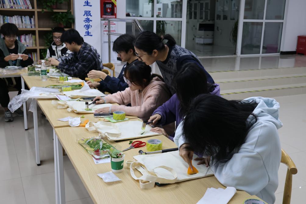 11月14日,江苏信息职业技术学院“草木有语”修养轩在一站式学生社区开展“一叶一印,留驻自然”植物拓印非遗体验活动。