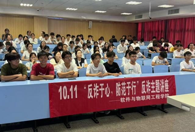 10月11日下午14时30分,为提升新生的反诈意识与风险防范能力,江西财经大学软件与物联网工程学院纪保部在第三教学楼3105教室组织举办了反诈知识宣传讲座。本次讲座特别邀请南昌市公安局杨心怡警官担任主讲人,2025级新生参与讲座。