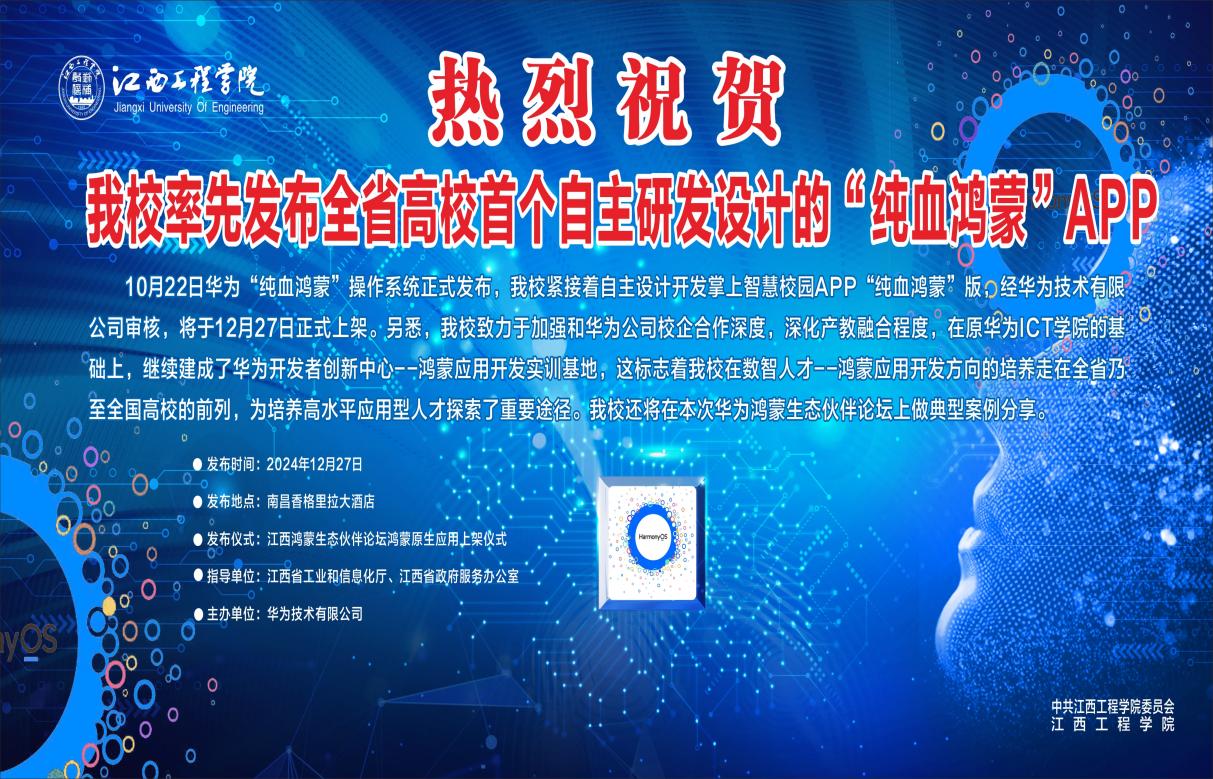 产教融合,创新发展。2024年,江西工程学院投入350余万元,与华为公司成立了华为开发者创新中心——鸿蒙系统应用开发实训中心,率先在全国高校范围内开发出智慧校园鸿蒙版APP,并获邀在江西华为鸿蒙生态伙伴论坛上作典型案例分享。联合珠三角校友会在深圳成立了江西工程学院大湾区实习实践教学管理指导中心和江西工程学院AI与智慧产业研究院。引进镇江市龙昊起重机械制造有限公司成立校中厂,形成了校——友——企合作办学、合作育人、合作就业的良好局面,为学校的发展注入了新的活力。