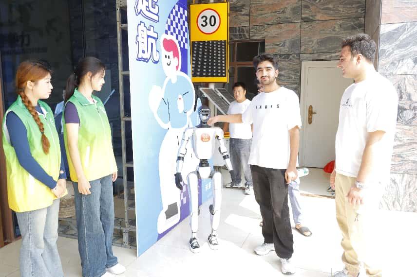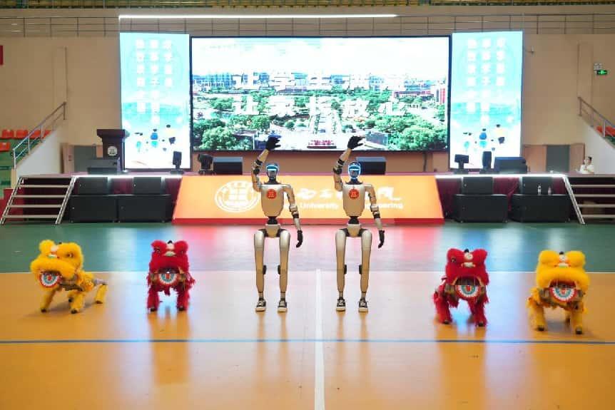 校园“科技向导团”格外吸睛。人形机器人“江小工”主动询问新生信息,规划路线并陪同完成全流程;门口四足机器狗随音乐舞动,吸引新生驻足拍照,缓解初入校园的紧张感,达成“人机互动·燃动青春”。