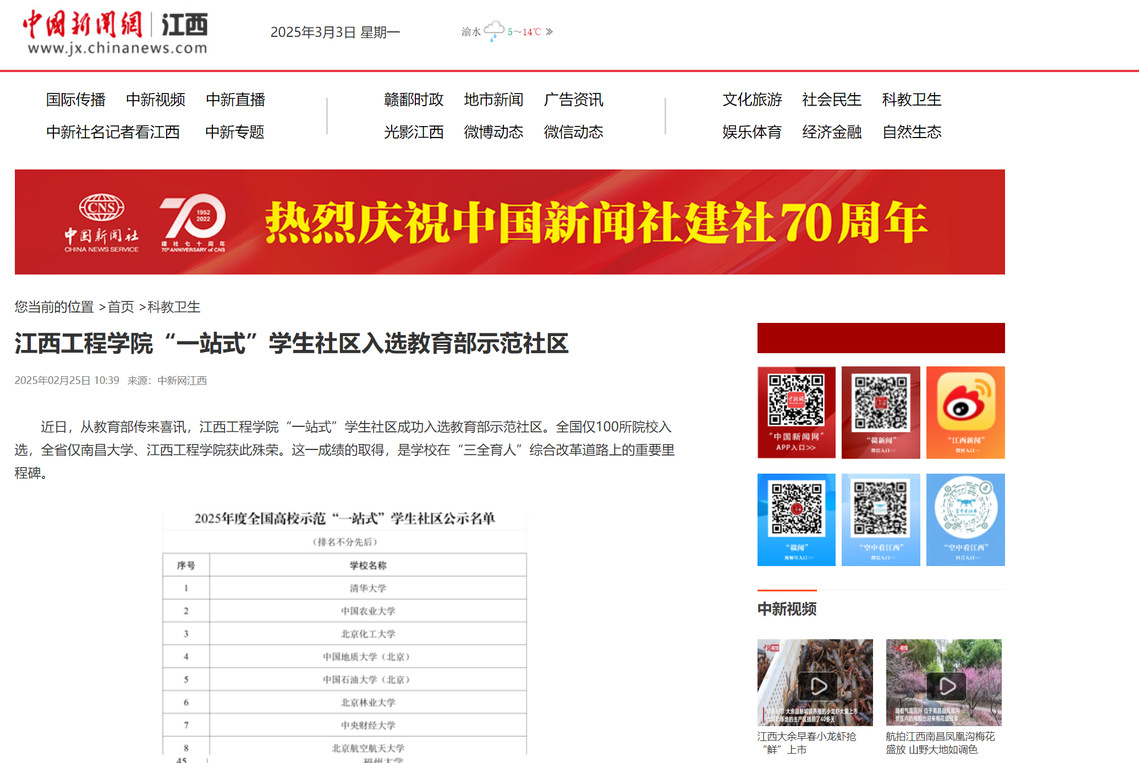 在思政育人领域,学校以红色文化与天工文化为根基,强化思政引领力。完善“一站式”学生社区功能,以“北斗星”校级党建品牌为引领,其“一站式”学生社区入选全国高校示范育人功能案例,2025年8月“匠心辅导员工作室”入选全国高校辅导员工作室联建共建行列;组织38支队伍开展2025年大学生暑期“三下乡”社会实践活动,其中“语润乡土,普声同行”实践队入选全国“推普助力乡村振兴”志愿服务团队,引导学生扎根红色沃土;推动铸牢中华民族共同体意识教育,赴新余市少数民族村开展专题学习研讨,教师在全省“同心‘石榴籽’共筑中国梦”主题班会展示活动中获三等奖;协办2025“亲情中华・中国寻根之旅”夏令营江西新余营,促进中外文化交流。