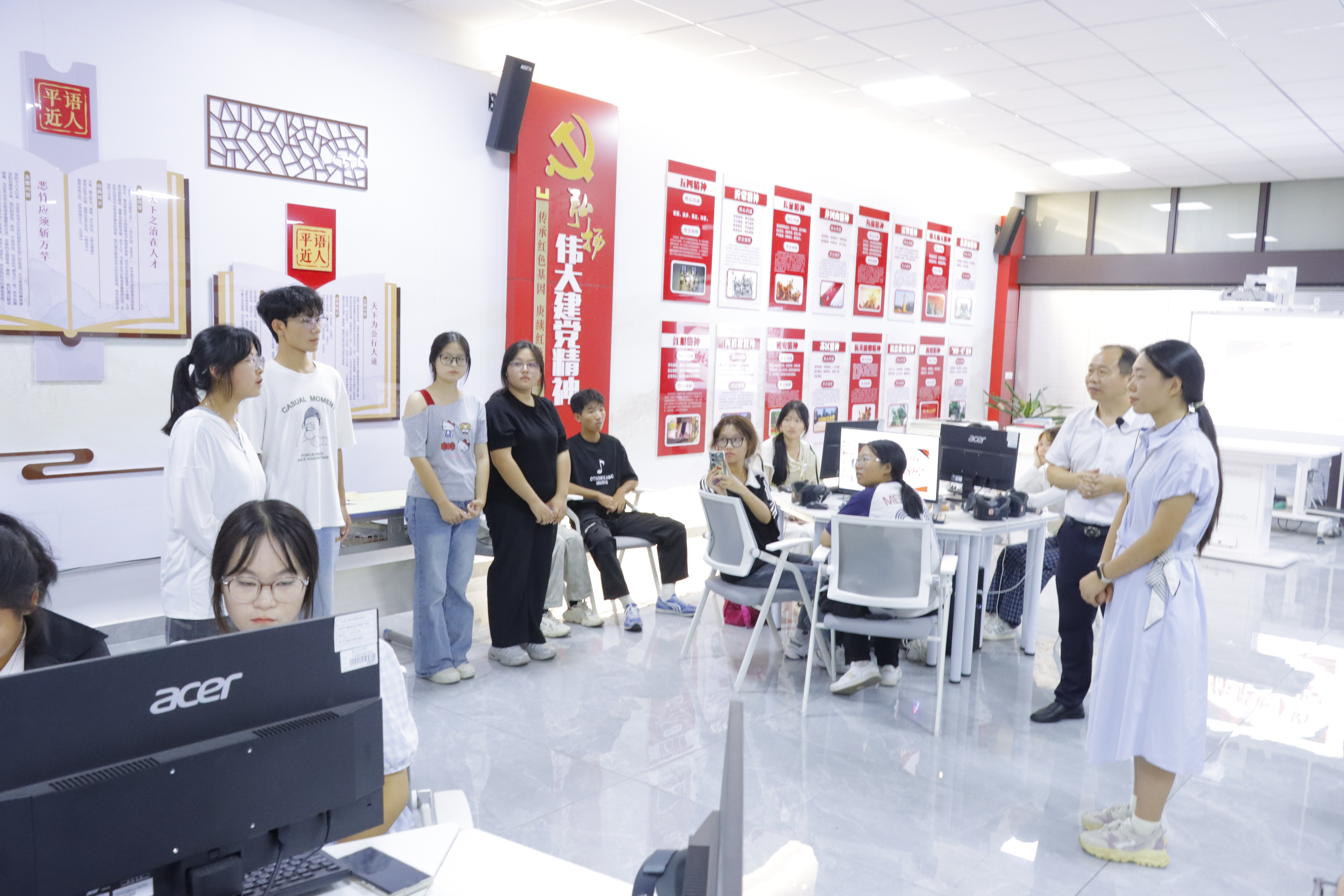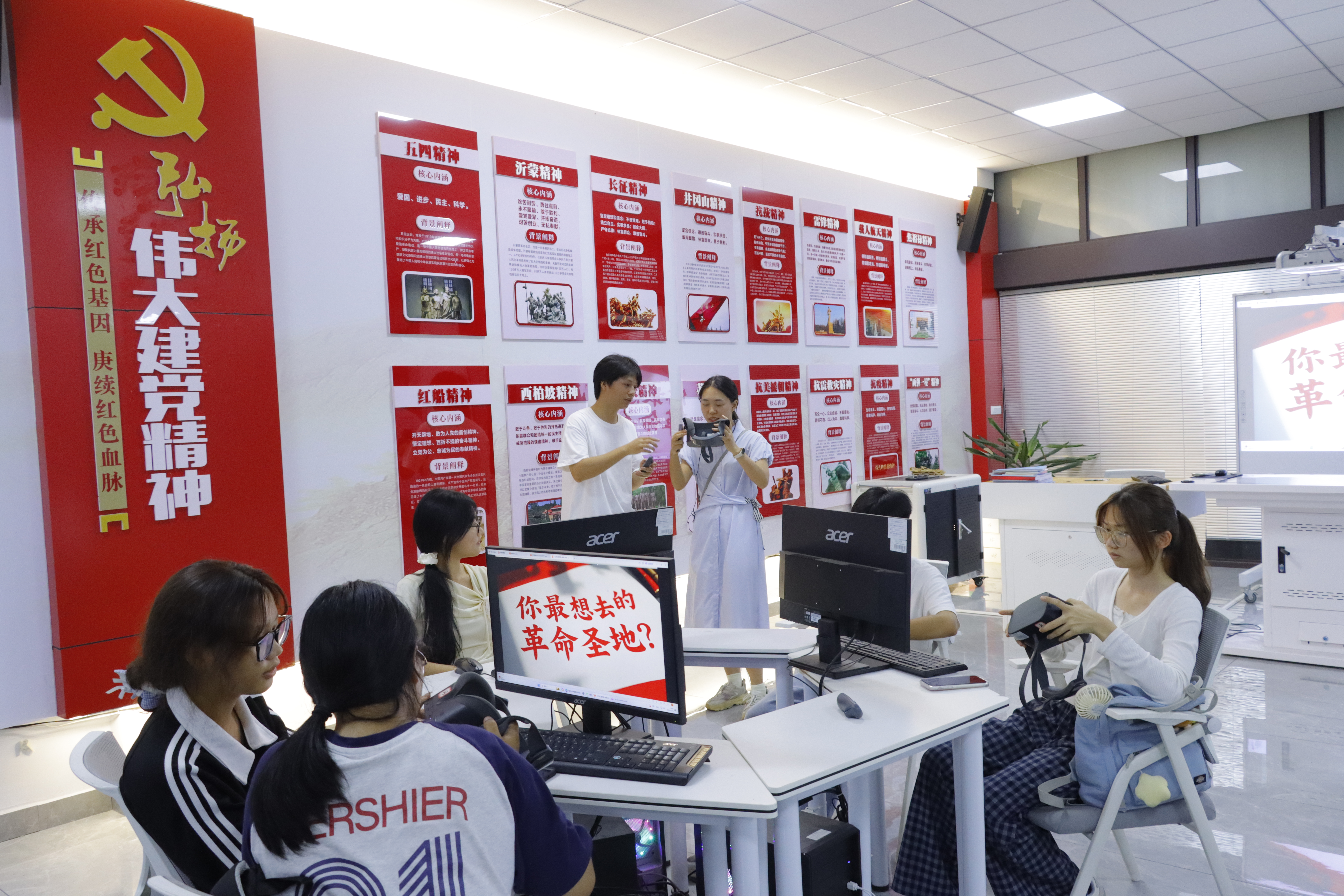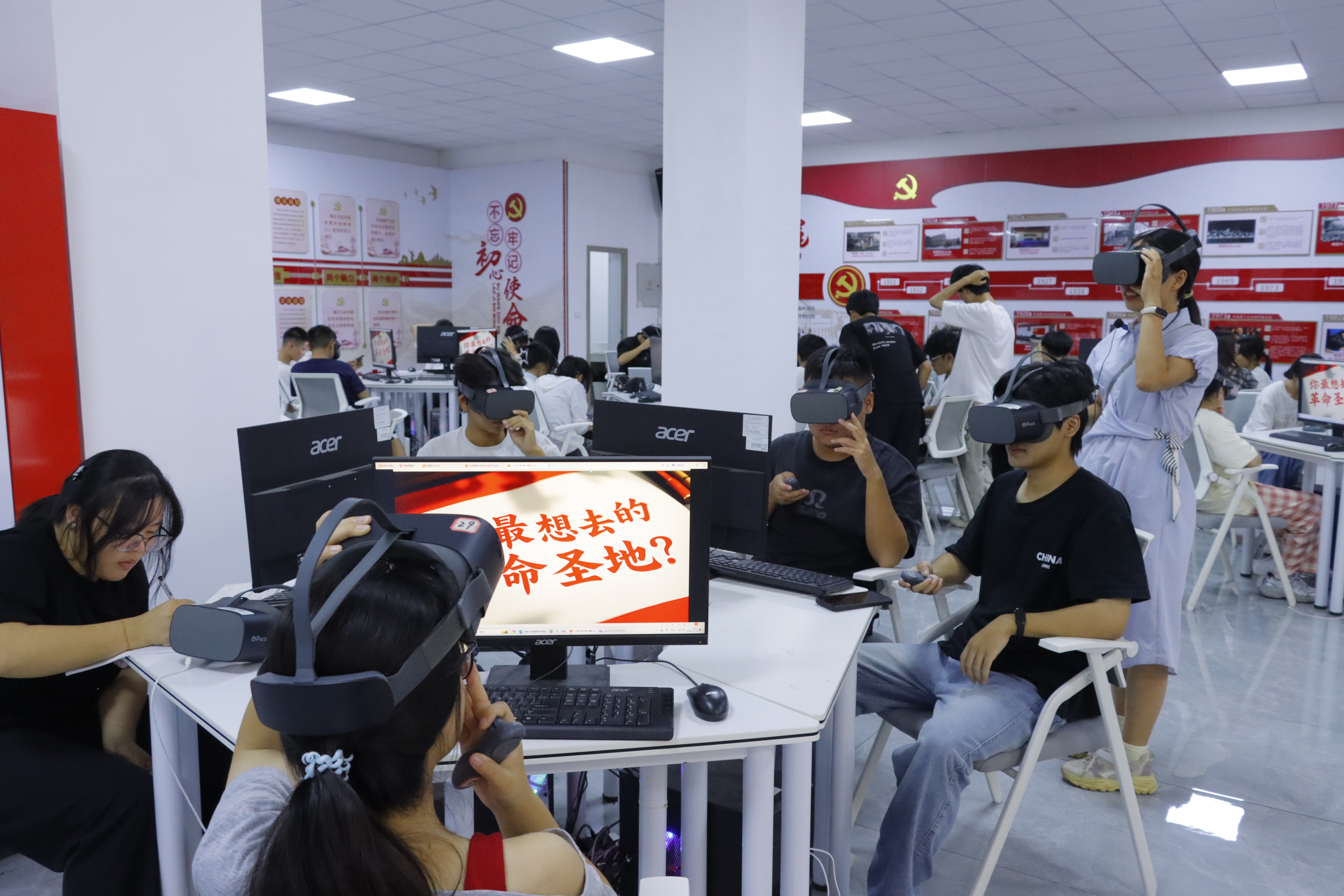 在思政VR体验环节,同学们戴上VR眼镜参与红色电影等模拟场景体验。龚丽将“农村包围城市”理论与井冈山革命斗争、红军长征等VR实景模型相结合,通过“问题+情景体验”的方式引导学生思考,让抽象概念具象化,繁杂理论变得触手可及。这种“理论+实践”的学习模式,让学生们深刻体会革命先辈的艰辛与伟大,也更加懂得珍惜如今的幸福生活。