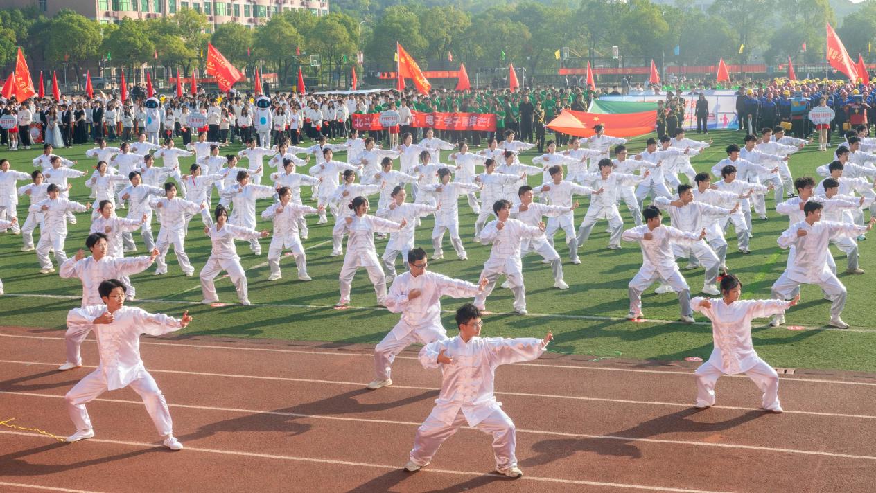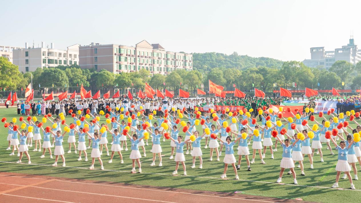 智能制造与建造学院黄子轩同学、军事体育教学部钱斌老师分别代表运动员、裁判员宣誓。军事体育教学部武术选修班以一场精彩绝伦的表演,将中华武道“刚柔相济、动静相生”展现得淋漓尽致,将开幕式推向高潮。随后,以爱国为主题的集体花球啦啦操用整齐队形传递爱国热忱,让青春活力与家国情怀闪耀赛场;花球啦啦操2025年全国统一初级B比赛套路的表演用整齐的队形变换、有力的动作展现青春风采;校团委社团纽克175街舞社以行云流水的表演为开幕式圆满收尾,为整场运动会注入了蓬勃活力和无限激情。