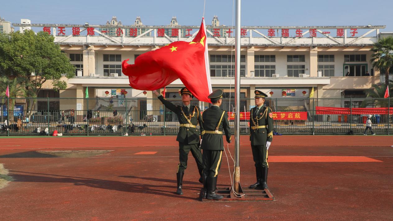 在庄严的国歌声中,鲜艳的五星红旗冉冉升起,全场师生肃立行注目礼。
