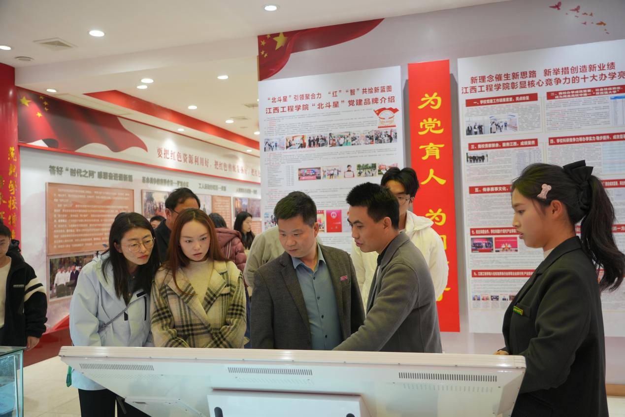 考察期间,调研组先后走访了江西工程学院学生社区服务中心、党团活动室、创客中心、红芯先锋工作室、思政VR实践中心、铸牢中华民族共同体意识展示馆等功能场所。代表们边走边看、边问边议,详细询问江西工程学院“一站式”学生社区运行管理机制、设施资源配置、学生参与组织架构等情况,近距离感受社区温馨舒适的生活氛围、丰富多彩的实践活动和健全规范的管理制度。考察过程中,双方就社区建设中的难点问题、创新举措、经验推广等内容展开深度交流。