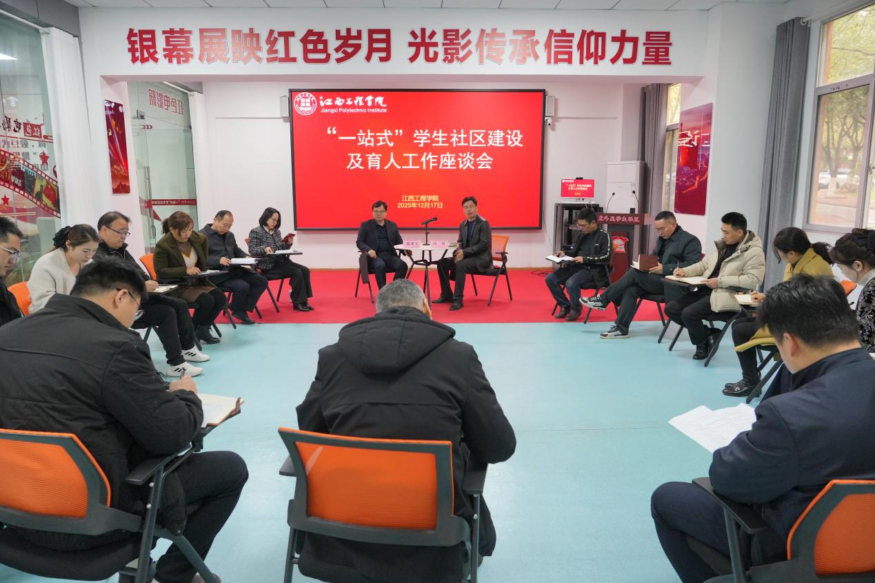 12月17日,江西工程学院在天工校区“一站式”学生社区红色影院召开“一站式”学生社区建设及育人工作座谈会,总结2025年建设成果,部署2026年重点工作。校党委书记、督导专员魏建克,党委副书记、副校长冯赟出席会议。会议由冯赟主持。