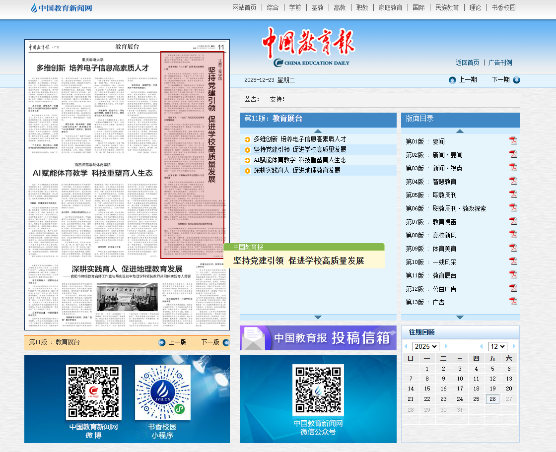 近日,江西工程学院以《坚持党建引领 促进学校高质量发展》为主题的育人实践成果,在《中国教育报》正式刊发,全面展现学校构建“党建引领、社区育人、内涵发展、校地协同”的“北斗星·红智”党建品牌探索路径与显著成效,引发广泛关注。