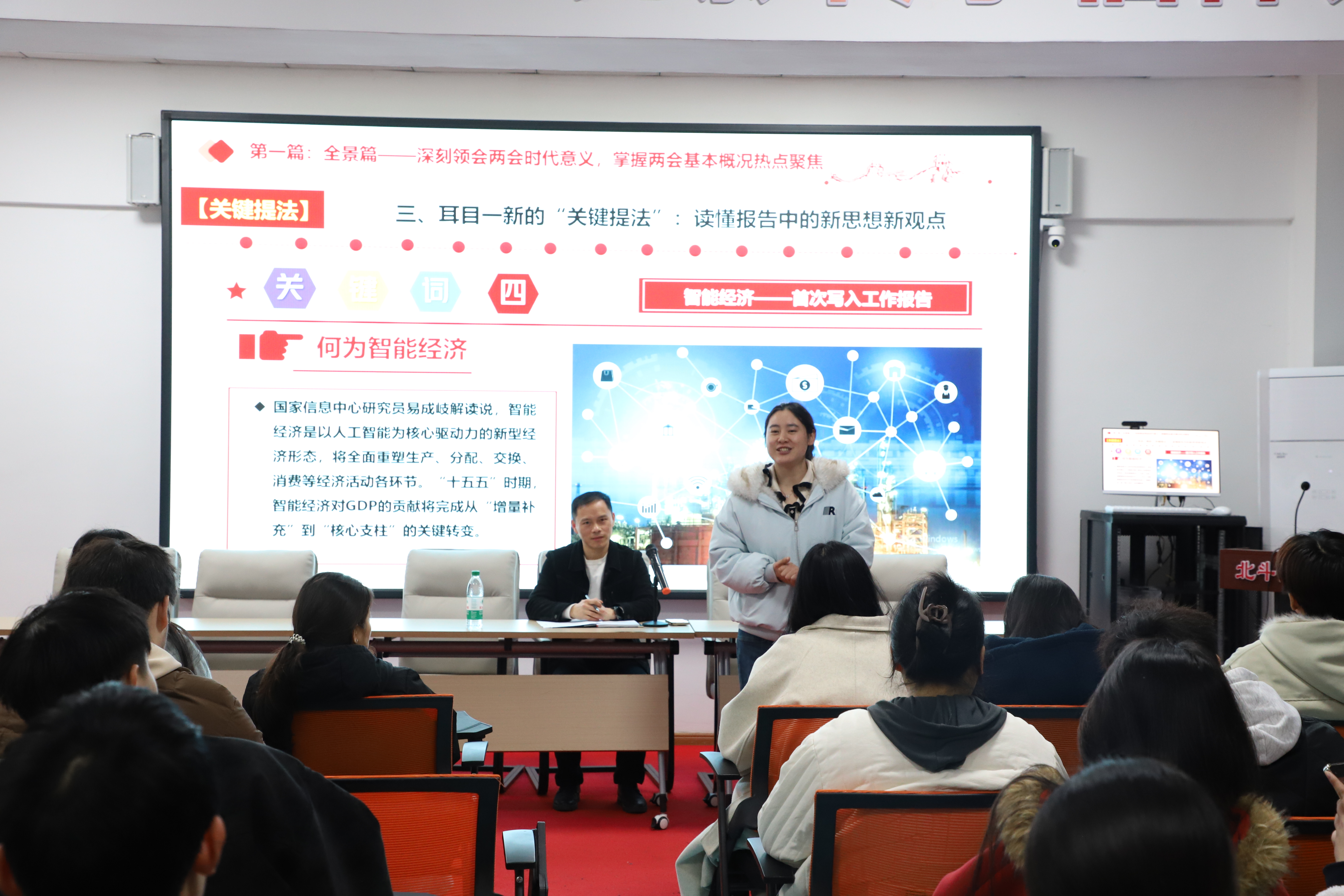 春潮涌动处,奋进正当时。3月27日晚,江西工程学院“一站式”学生社区灯火通明,“北斗星・天工夜话”2026年第1期活动如期举行。本次活动以“全国两会精神宣讲+本科教学工作合格评估动员+寒假‘4+X’实践分享”为核心内容,通过理论解读、政策宣讲、经验交流等形式,为来自抱石艺术学院、经济管理学院等4个学院的60余名团学干部及辅导员代表搭建了思想引领与实践交流的平台。活动由学工部副部长周卫忠主持,马克思主义学院直属党支部书记于永清、辅导员李桃分别作专题宣讲。
