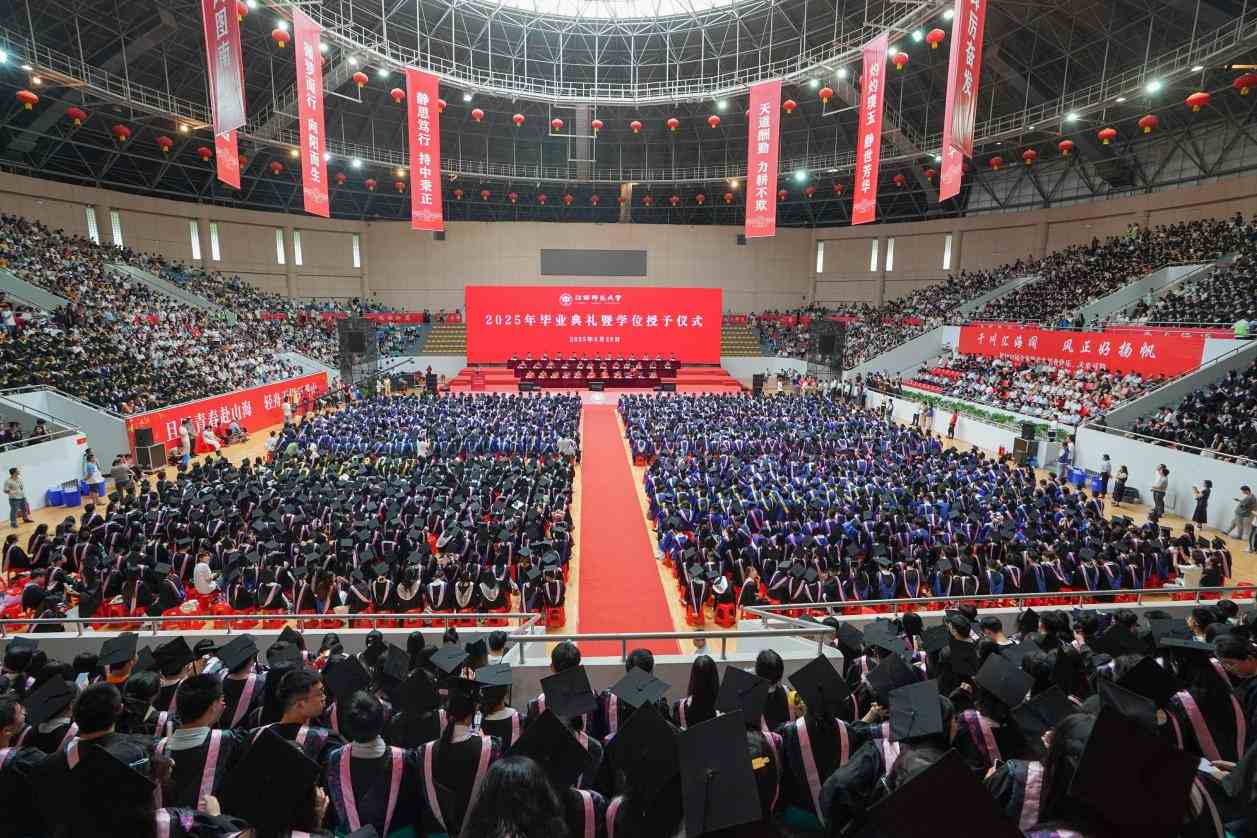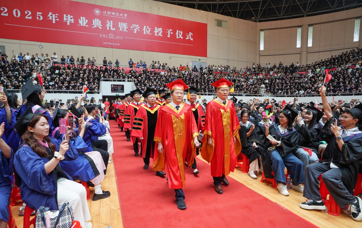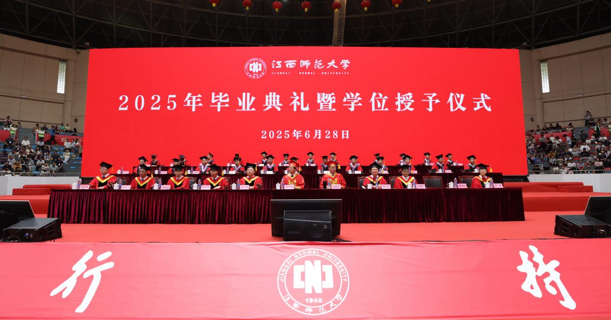 瑶湖畔,朝霞起;鲲鹏志,正当时。6月28日上午,江西师范大学2025年毕业典礼暨学位授予仪式在瑶湖体育馆隆重举行。校领导朱小理、陈芬儿、汪洋、姚弋霞、舒平贵、周利生、刘利民、董圣鸿、钟业喜、葛咏,校党委常委、统战部部长曹泽华,校友代表郭兴敏等出席。校学位评定委员会委员、各单位各部门负责人、研究生导师、毕业班辅导员、校友代表、毕业生及亲友代表共计6000余人齐聚一堂,共同见证毕业生们踏上人生逐梦新征程的重要时刻。