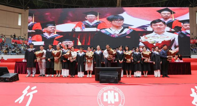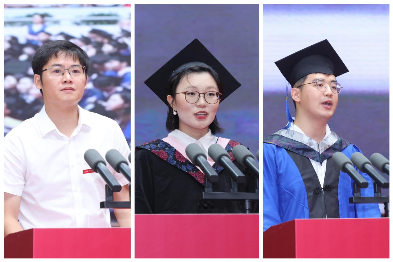 教师代表、化学与材料学院教授、青年学者廖勋凡发言,结合自己作为“90后”教师的求学与科研经历,鼓励毕业生甘于奉献、勇担使命。毕业生代表政法学院2021级法学专业本科生亓乐健、数学与统计学院2022级数学专业硕士研究生虞泳波先后发言,回顾在师大的成长点滴,表达了对母校的感恩之情与对未来的憧憬祝福。