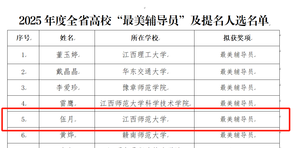 近日,江西省教育厅公示2025年度全省高校“最美辅导员”推选活动评审结果,我校经济与管理学院辅导员伍月名列其中。这是省委教育工委、省教育厅自2018年开展全省高校“最美辅导员”评选活动以来,我校辅导员连续第八次获评,与南昌大学并列为全省获评此殊荣最多的高校。