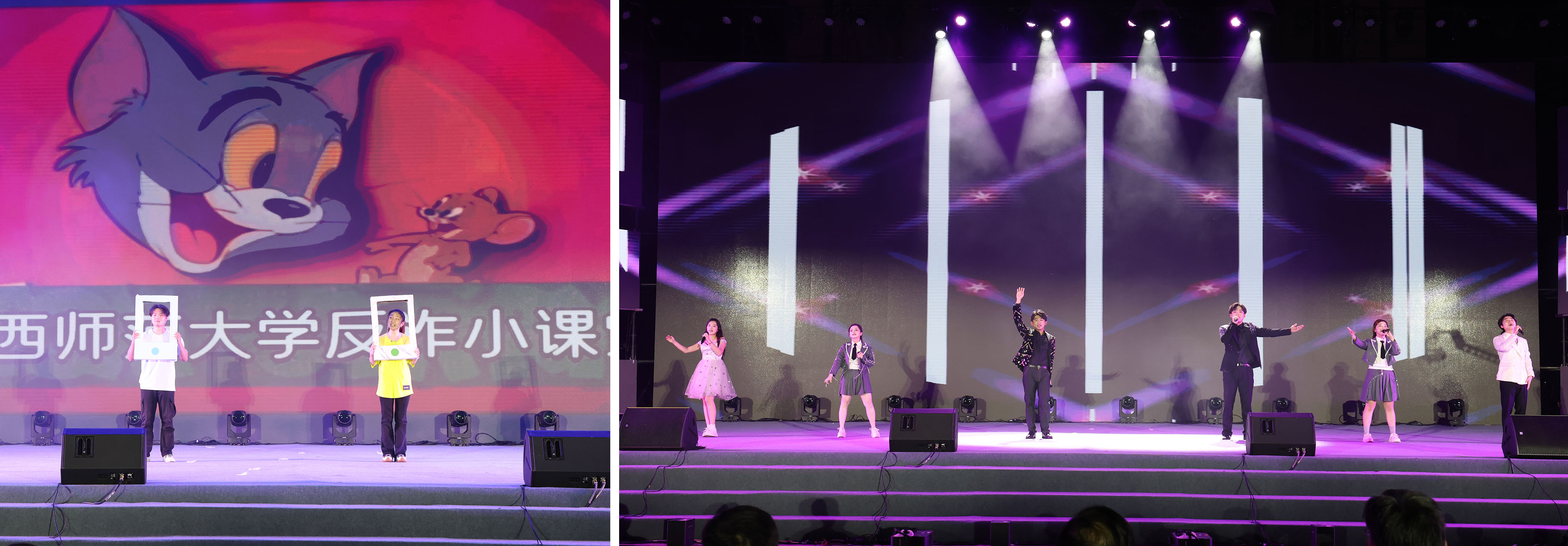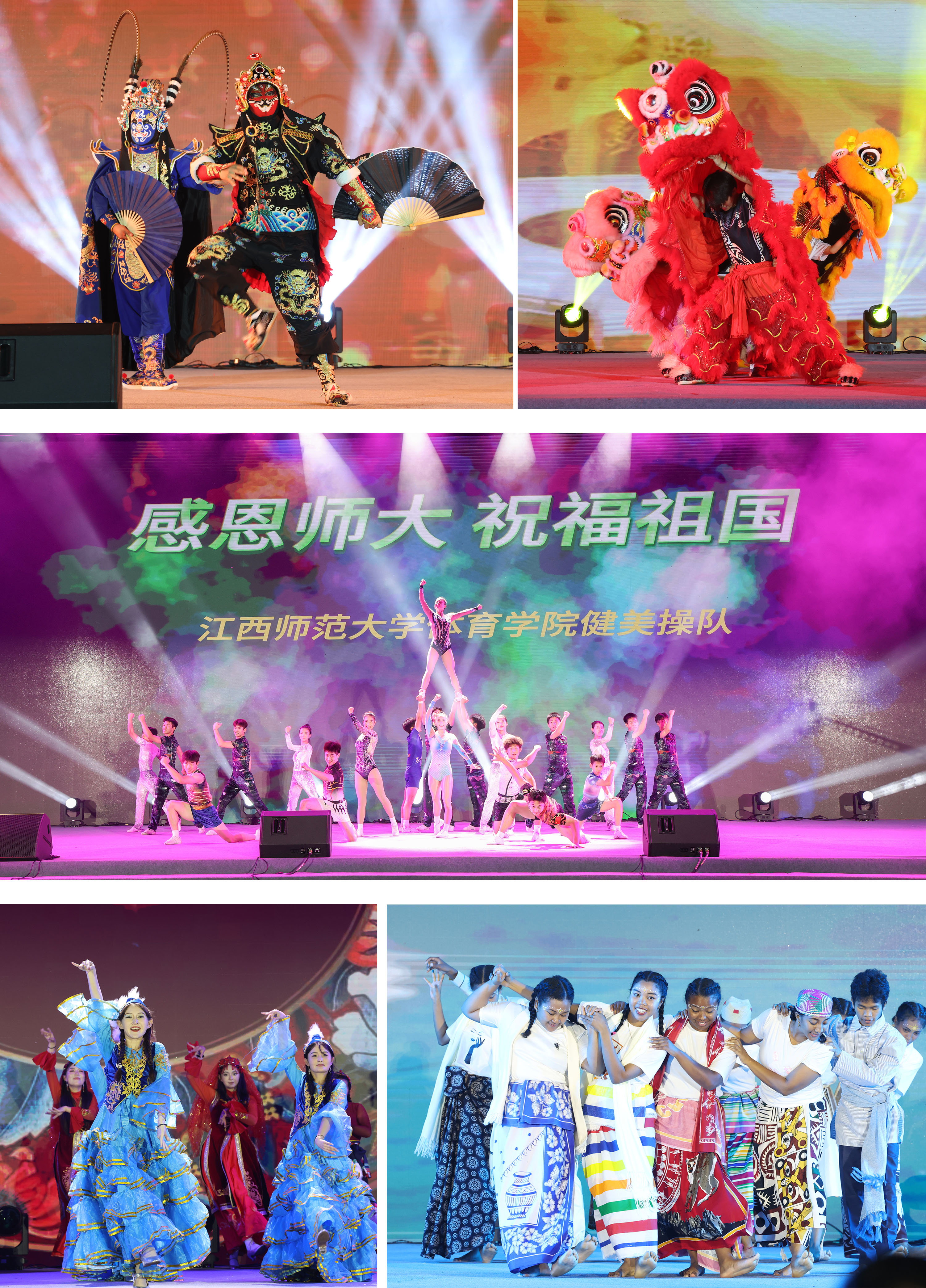 晚会在恢弘激昂的交响乐《丰收》中拉开帷幕。男声独唱《黄河颂》、琵琶演奏与舞蹈《情满书香园》、独唱《十送红军》与朗诵《读中国》、萨克斯六重奏《红色童谣》等节目,激昂的旋律、深情的朗诵、悠扬的器乐,展现了师大学子胸怀家国、追寻理想的初心与担当;传统文化节目《风起云涌》融合武术、变脸与舞狮,马达加斯加留学生舞蹈《闪耀的我们》,学校健美操队《舞动青春 荣耀师大》和少数民族舞蹈《石榴凝情·舞颂同心》等节目,活力四射、多元交融,展现了师大学子传承民族文化、加强各民族交往交融的胸怀与担当;流行歌曲串烧、情景剧《反诈小课堂》、现代舞《迎风起跑》、《青春向祖国告白》、歌舞《灯火里的中国》,寓教于乐、韵律悠长、燃动全场,展现了师大学子蓬勃向上的青春动能。