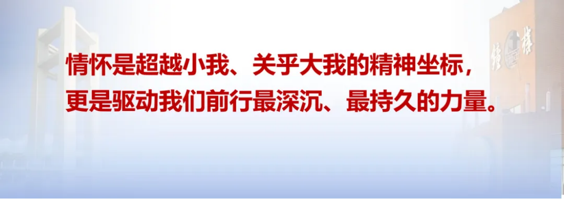 同学们,情怀是超越小我、关乎大我的精神坐标,更是驱动我们前行最深沉、最持久的力量。你们是实现中华民族伟大复兴关键时期的见证者、建设者和推动者。希望你们涵养深厚的家国情怀,以赤子之心感知时代脉动,将个人奋斗精准定位于“强国建设、民族复兴”的坐标,把对祖国的深情、对江西师大的热爱、对家人的感恩转化为清晨图书馆里静心学习的韧劲,烈日运动场上挥汗训练的坚毅,深夜实验室里反复试验的执着。